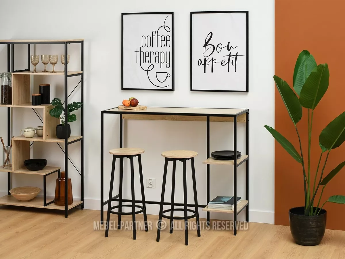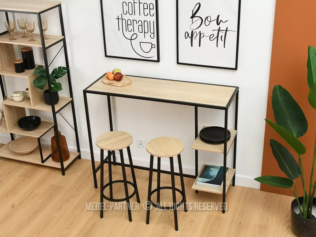 Barový stůl se židlemi RONAL je dokonale funkčním a praktickým doplňkem kuchyně. Boční police nabízí prostor k vystavení dekorací nebo kuchyňských potřeb.