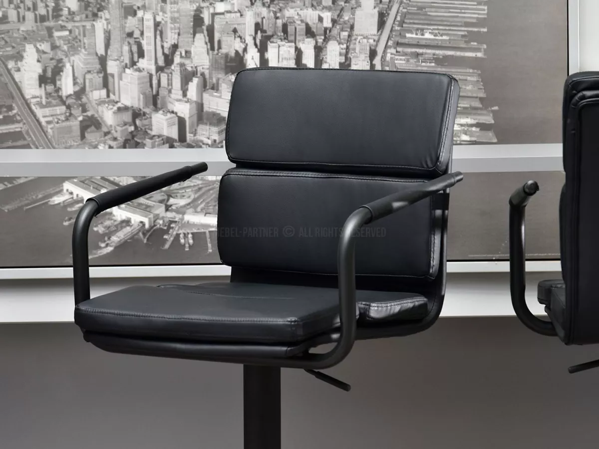 Nastavitelná barová židle CONSOLATA je vybavená vysokým měkkým opěradlem a područkami. Má stabilní kovovou základnu se zabudovanou opěrkou na nohy, o kterou si můžete opřít nohy a zvýšit pohodlí při sezení.