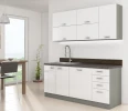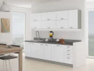 Třetí příklad je kuchyně v minimalistickém stylu, která klade důraz na jednoduchost a funkčnost. Tato kuchyně má bílé skříňky bez úchytů, které plynule navazují na bílé stěny a strop. Tento jednotný design zvětšuje vizuálně prostor a dodává kuchyni čistotu a světlost. Hlavním prvkem této kuchyně je vestavěná skříň s posuvnými dveřmi, která slouží jako úložný prostor i jídelna. Skříň je vybavena policemi, zásuvkami a skříňkami, které poskytují dostatek místa pro nádobí, přístroje a potraviny. Skříň také obsahuje vestavěnou troubu, mikrovlnnou troubu a lednici. Na skříni je skládací deska, která slouží jako jídelní stůl nebo pracovní plocha. Když se nepoužívá, složí se a schová do skříně, čímž uvolní prostor. K desce patří čtyři skládací židle s bílými plastovými sedáky a opěradly, které se také dají snadno uložit do skříně. Kuchyně je osvětlena vestavěnými LED světly, která jsou pod skříňkami a nad pracovní deskou.