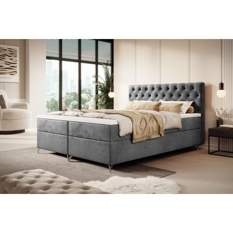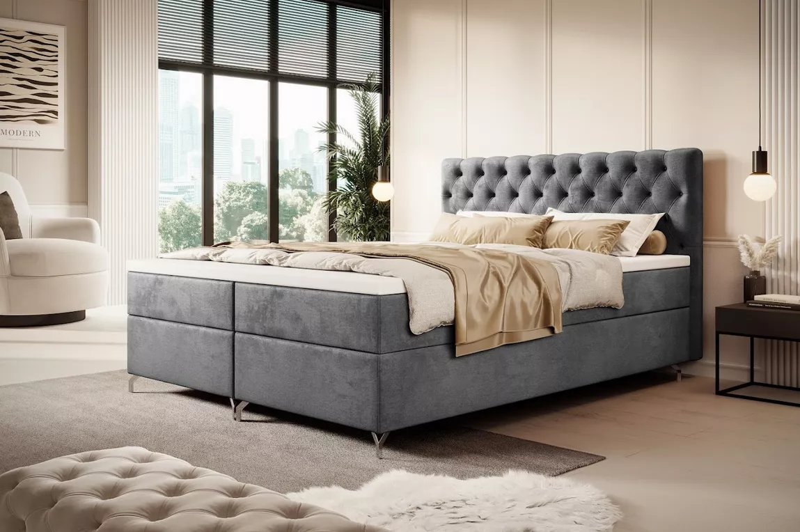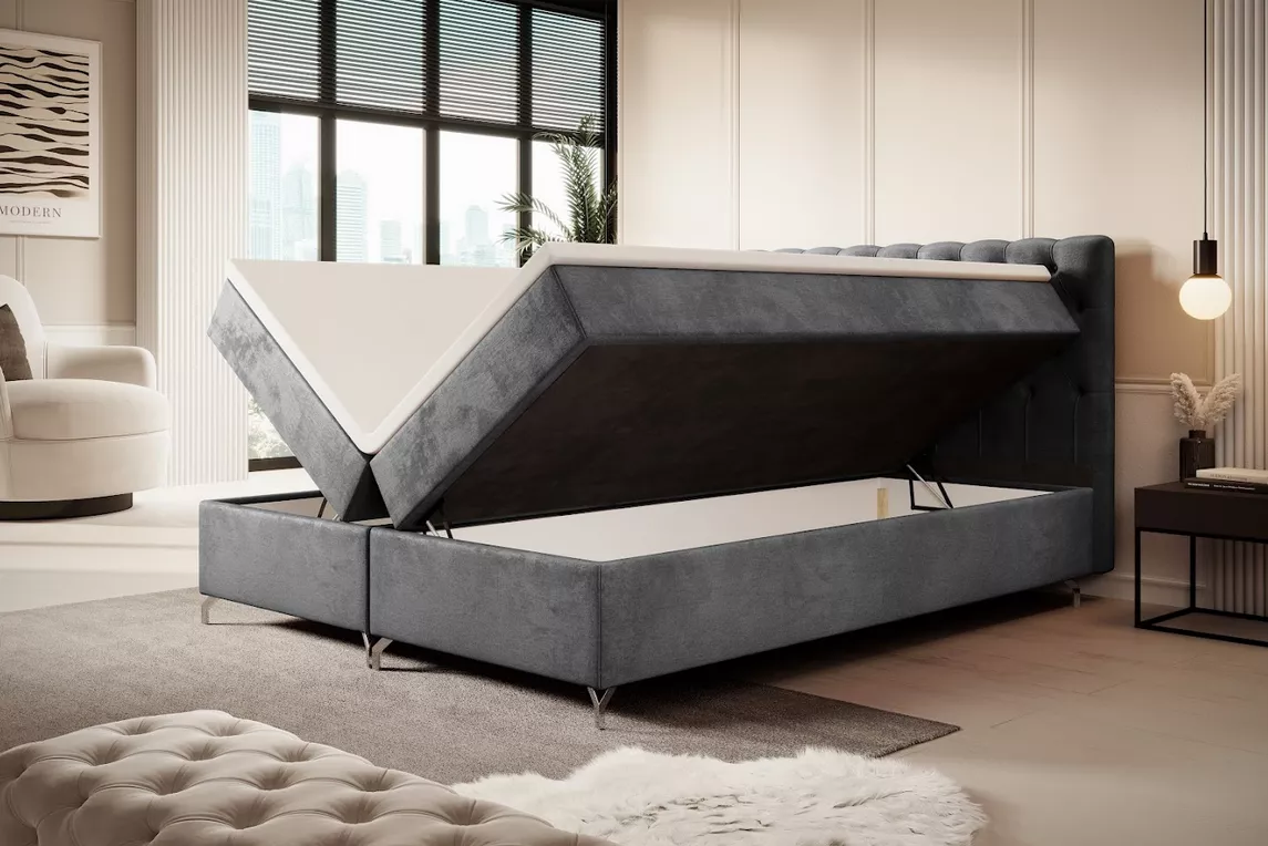 Boxspringová postel ADRIA se hodí do všech moderních ložnic. Čalouněné čelo zamezí poškrábání a zašpinění zdi. Disponuje 2 úložnými prostory pod výklopnými rošty.