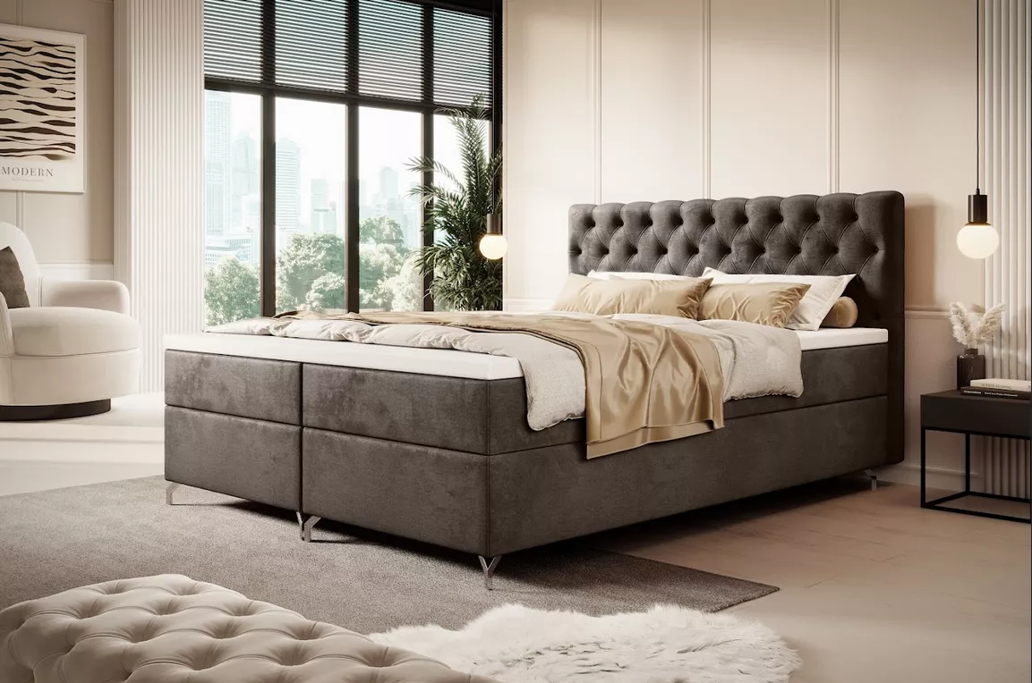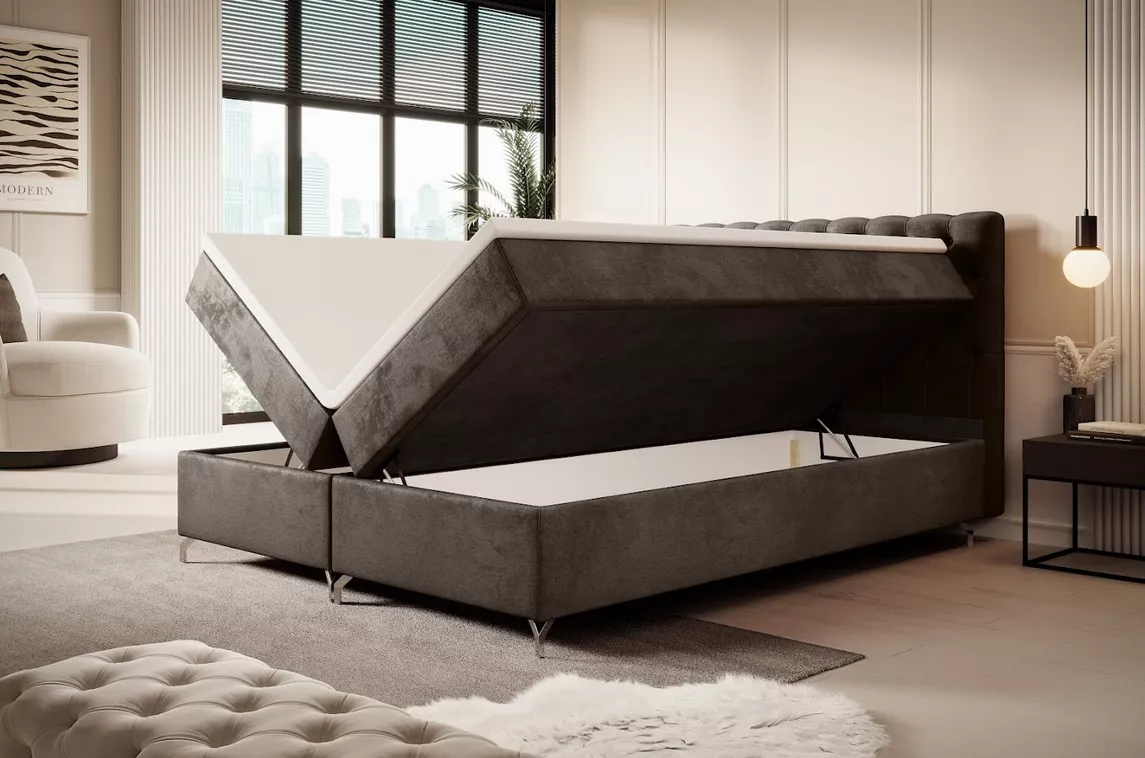 Boxspringová postel ADRIA se hodí do všech moderních ložnic. Čalouněné čelo zamezí poškrábání a zašpinění zdi. Disponuje 2 úložnými prostory pod výklopnými rošty.