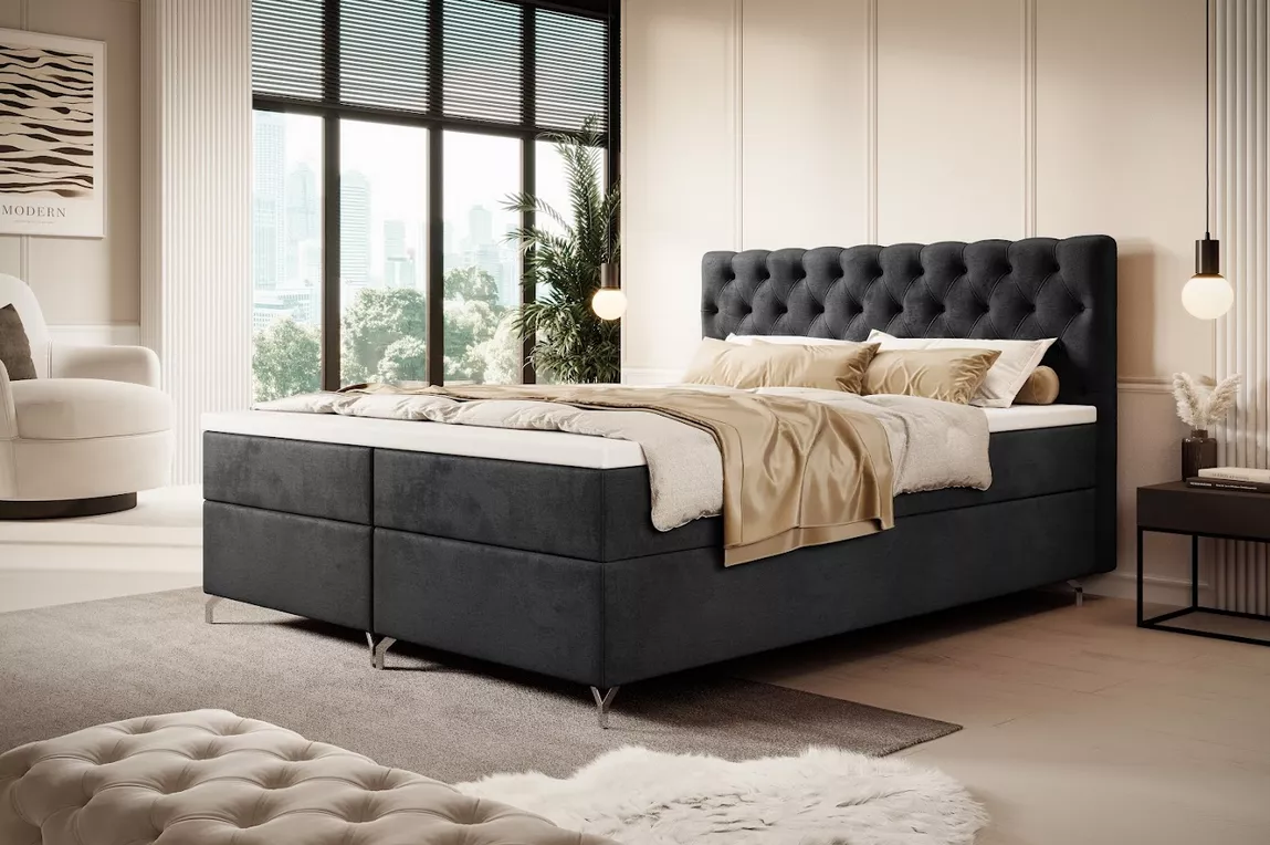 Boxspringová postel ADRIA se hodí do všech moderních ložnic. Čalouněné čelo zamezí poškrábání a zašpinění zdi. Disponuje 2 úložnými prostory pod výklopnými rošty.