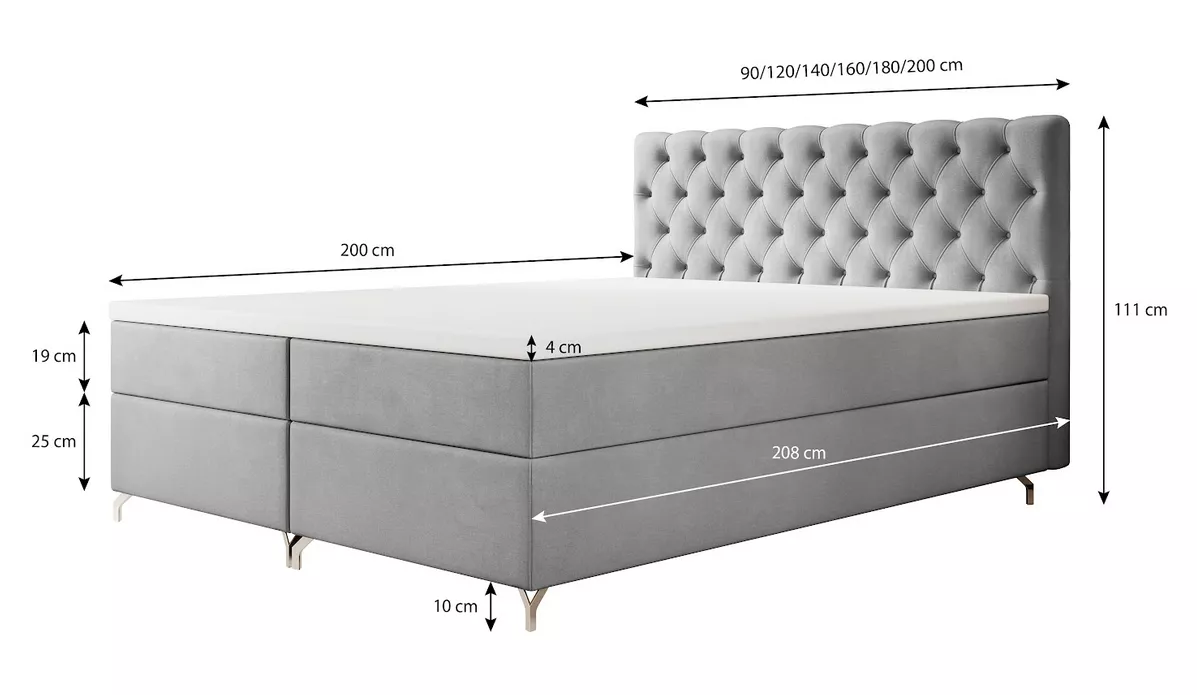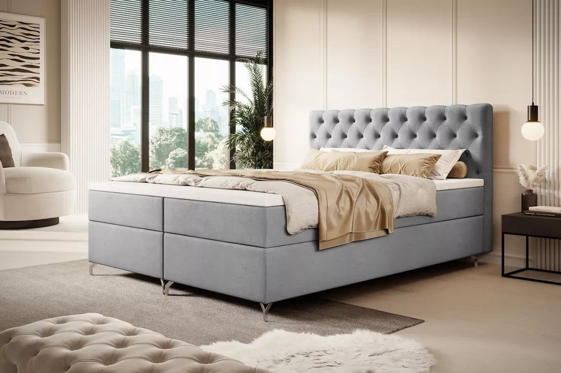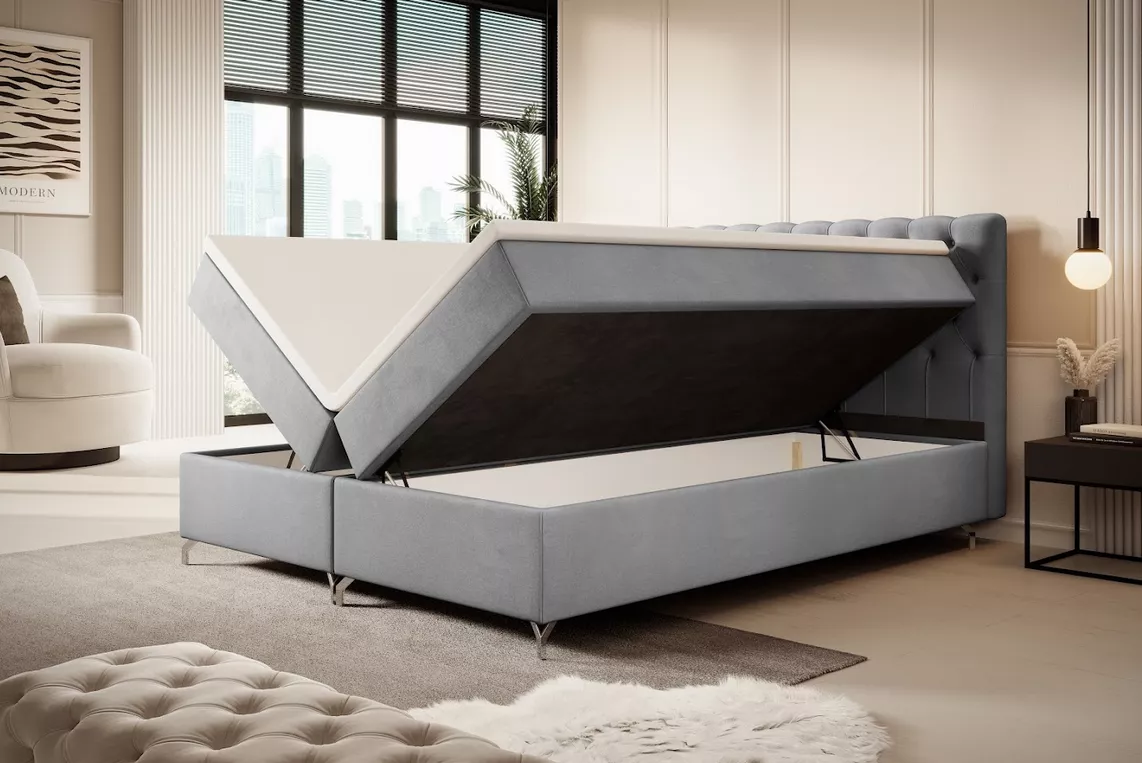 Boxspringová postel ADRIA se hodí do všech moderních ložnic. Čalouněné čelo zamezí poškrábání a zašpinění zdi. Disponuje 2 úložnými prostory pod výklopnými rošty.