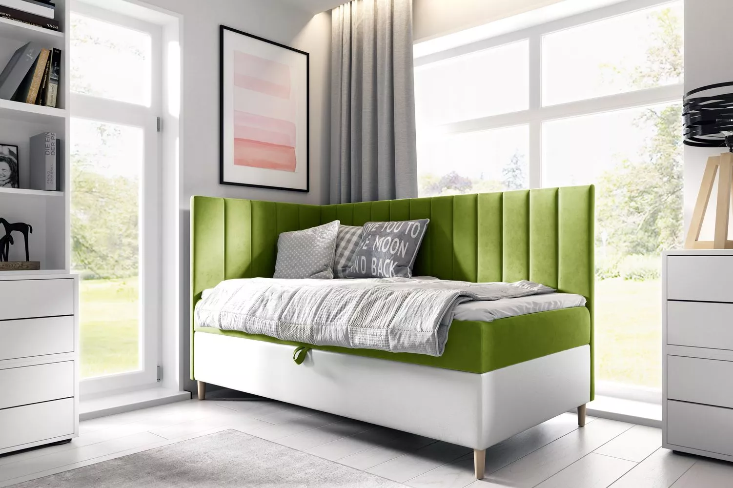 Kontinentální postel 100x200 MIREN 3 - zelená / bílá, otevírání z pravé strany + topper ZDARMA