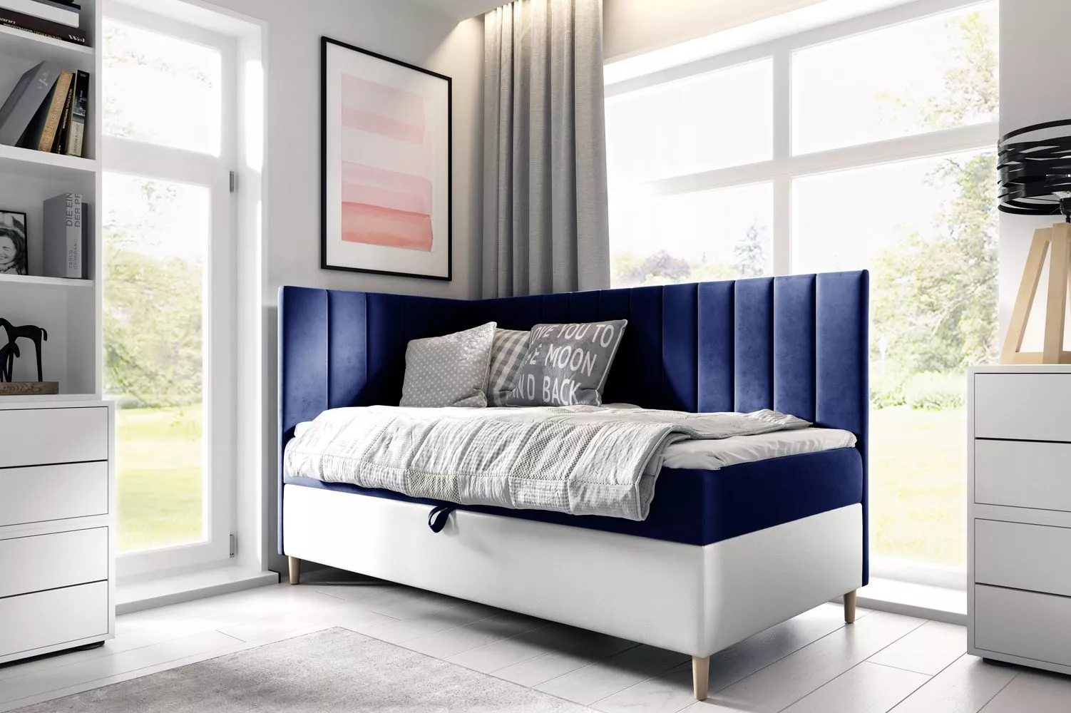 Kontinentální postel 100x200 MIREN 3 - tmavě modrá / bílá, otevírání z pravé strany + topper ZDARMA