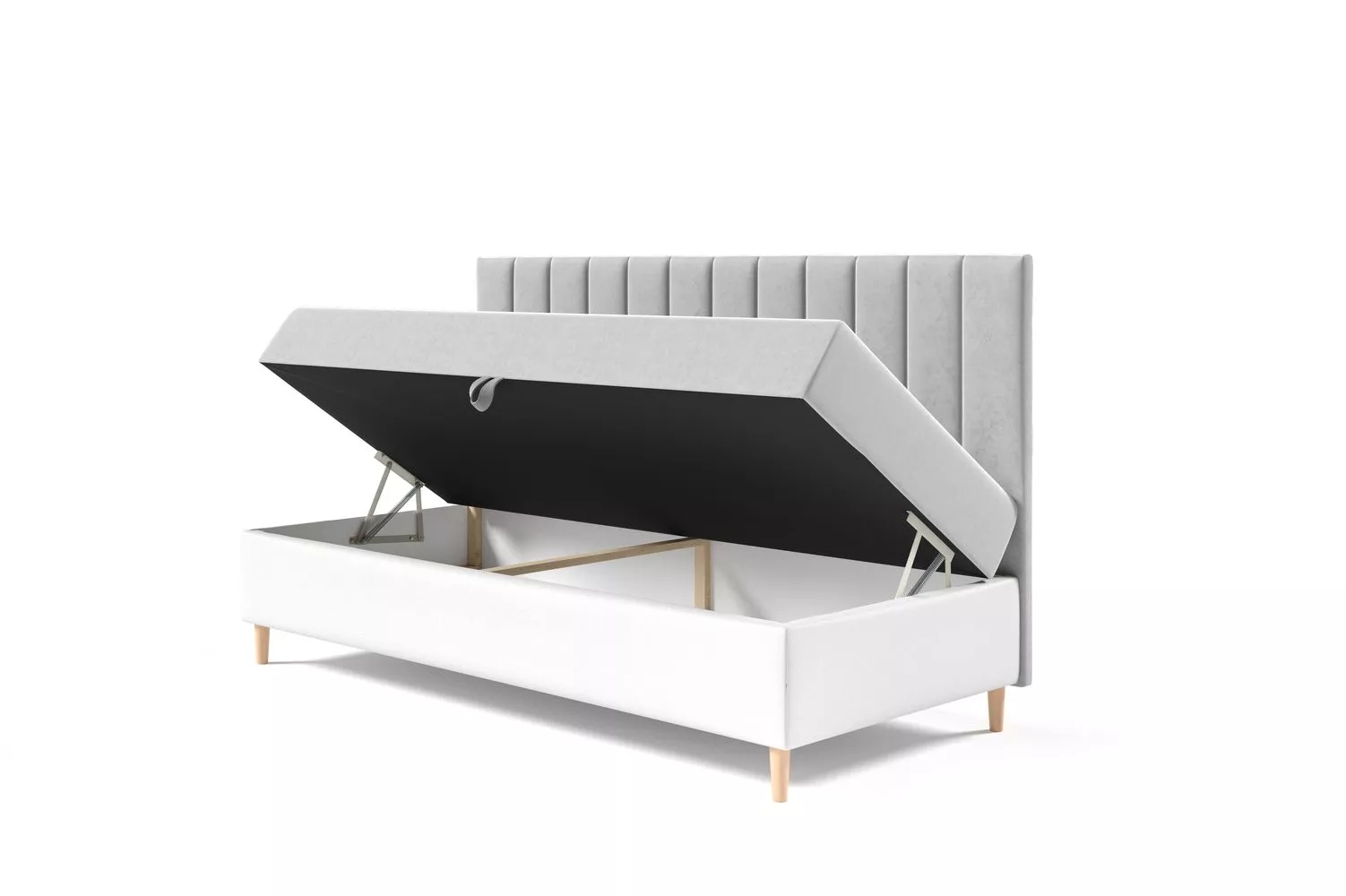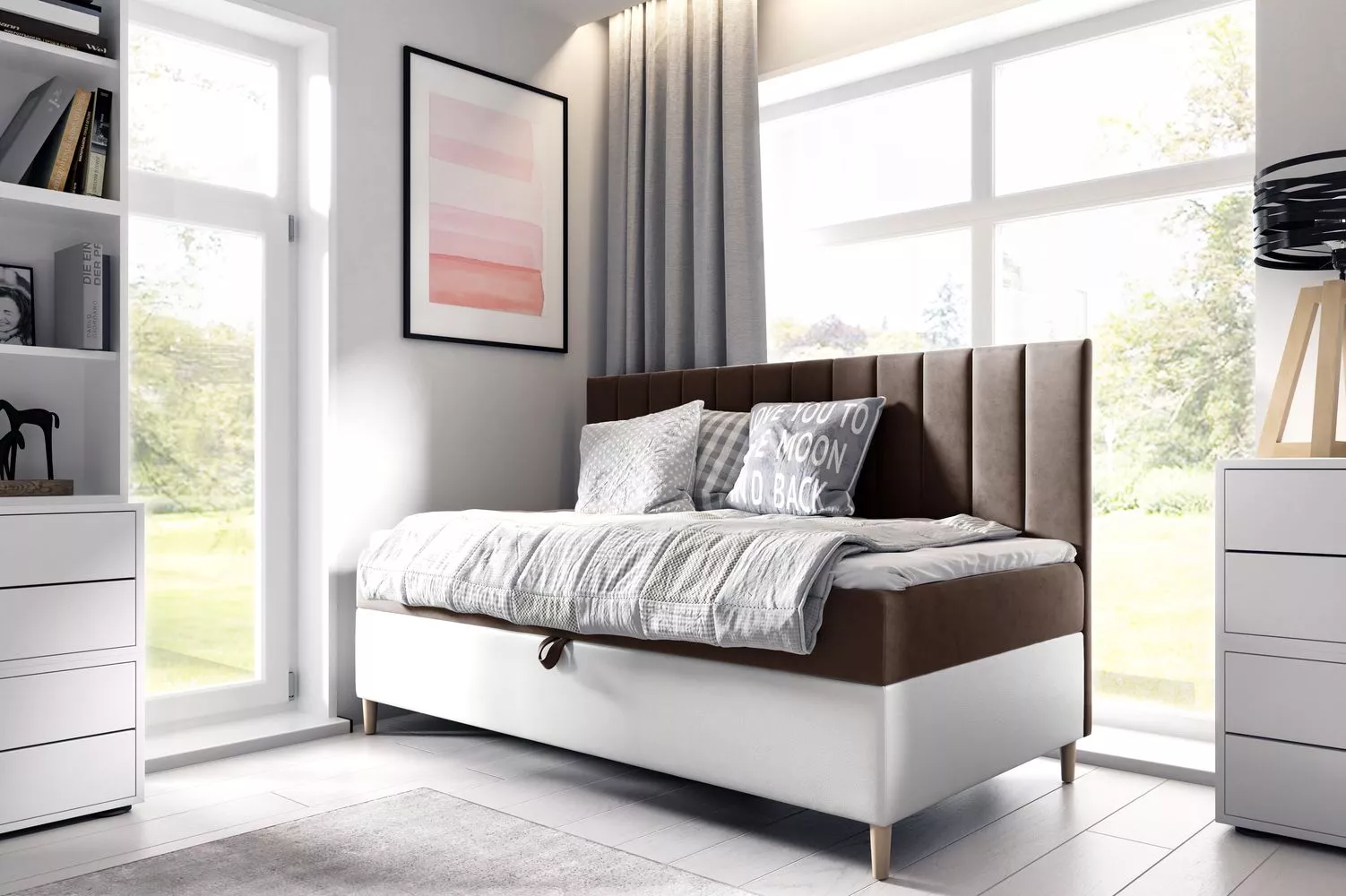 Kontinentální postel 80x200 MIREN 2 se hodí do všech studentských pokojů. Čalouněné čelo zamezí poškrábání a zašpinění zdi. Nechybí ani praktický úložný prostor otevíraný z levé strany postele.
