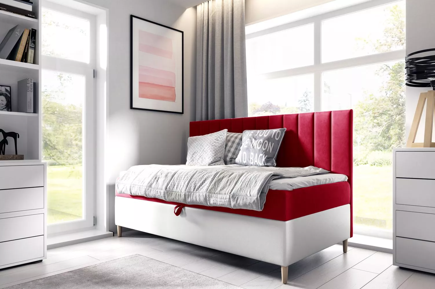 Kontinentální postel 100x200 MIREN 2 - červená / bílá, otevírání z levé strany + topper ZDARMA