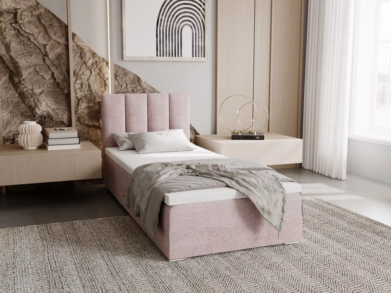 Součástí postele je zabudovaná matrace a úložný prostor. Postel dodáváme bez vyobrazeného topperu. Vhodné modely k dokoupení najdete v sekci Doporučujeme přikoupit.