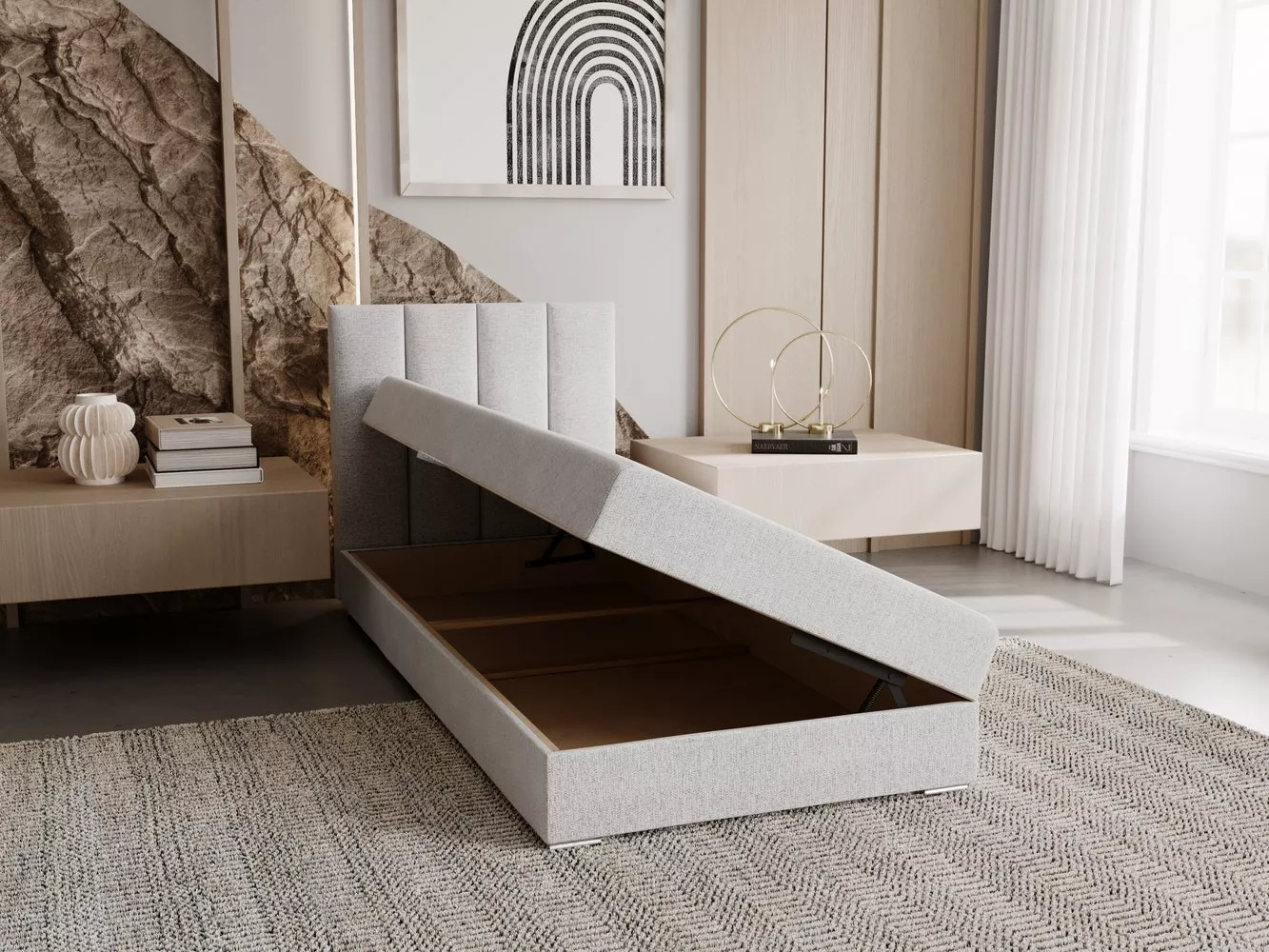Součástí postele je zabudovaná matrace a úložný prostor. Postel dodáváme bez vyobrazeného topperu. Vhodné modely k dokoupení najdete v sekci Doporučujeme přikoupit.