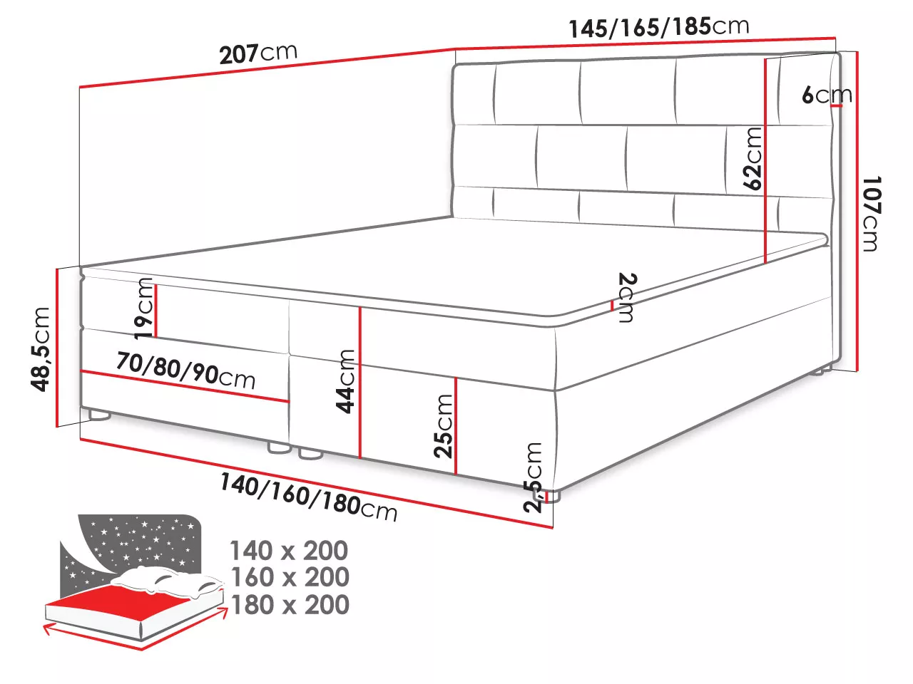 Boxspringová postel FIGIEL je navržena tak, aby zajistila maximální pohodlí a relaxaci. Hlavní matrace poskytuje tělu optimální oporu a dokonale se přizpůsobuje poloze během spánku. Součástí postele je i topper, který vyrovnává povrch matrace a zvyšuje komfort odpočinku. Postel disponuje 2 úložnými prostory umístěnými po stranách, které nabízejí snadný přístup a dostatek místa na lůžkoviny či další předměty.