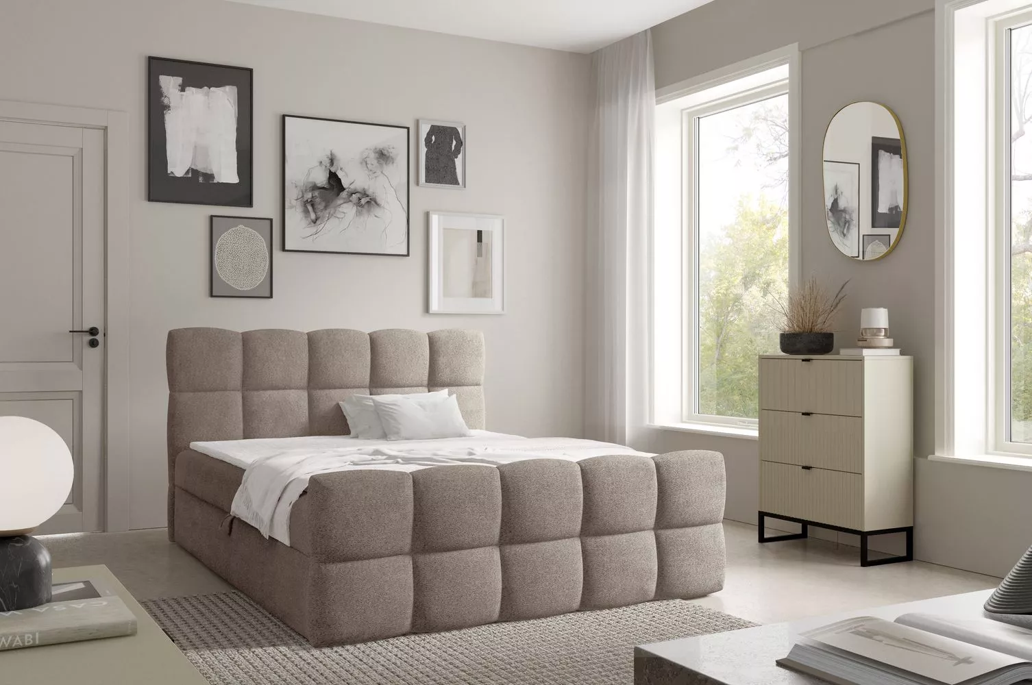 Kontinentální postel 140x200 ISEMBARD se hodí do moderních pokojů či ložnic. Čelo postele slouží jako opora zad, která zajišťuje pohodlný odpočinek vsedě, pokud si například chcete v posteli číst knihu nebo vypít ranní kávu. Úložný prostor je otevíraný z boku.