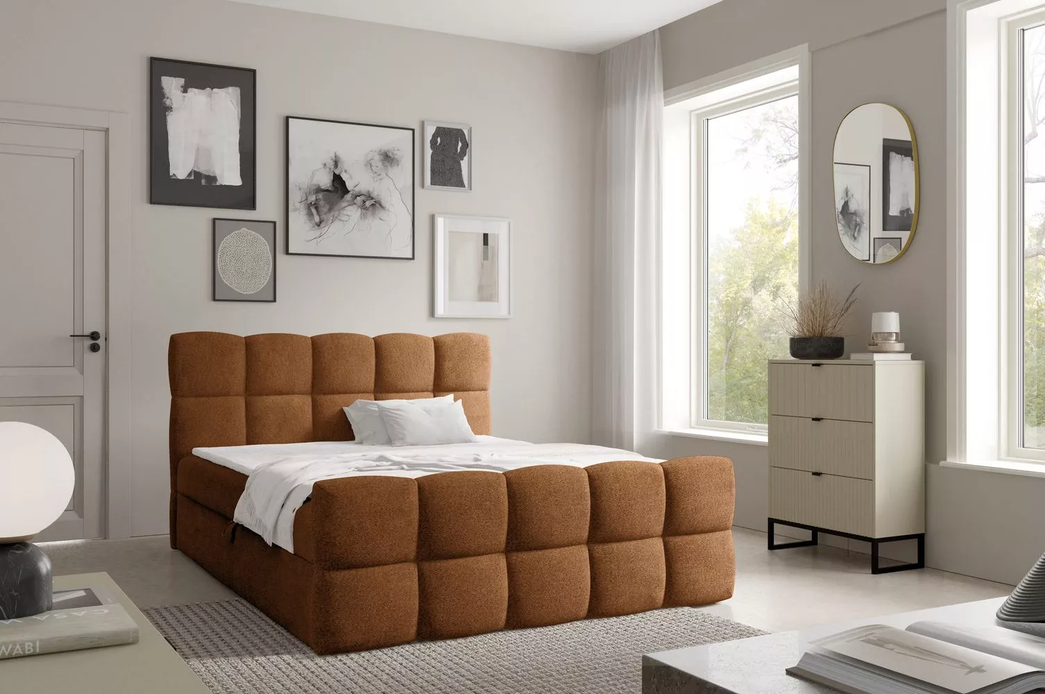 Kontinentální postel 180x200 ISEMBARD se hodí do moderních pokojů či ložnic. Čelo postele slouží jako opora zad, která zajišťuje pohodlný odpočinek vsedě, pokud si například chcete v posteli číst knihu nebo vypít ranní kávu. Úložný prostor je otevíraný z boku.