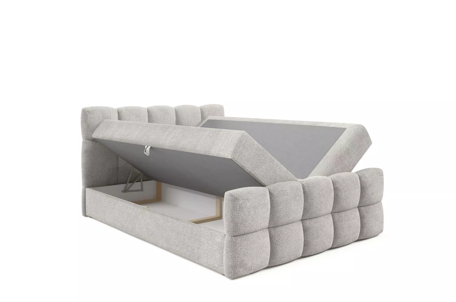 Kontinentální postel 200x200 ISEMBARD se hodí do moderních pokojů či ložnic. Čelo postele slouží jako opora zad, která zajišťuje pohodlný odpočinek vsedě, pokud si například chcete v posteli číst knihu nebo vypít ranní kávu. Úložný prostor je otevíraný z boku.
