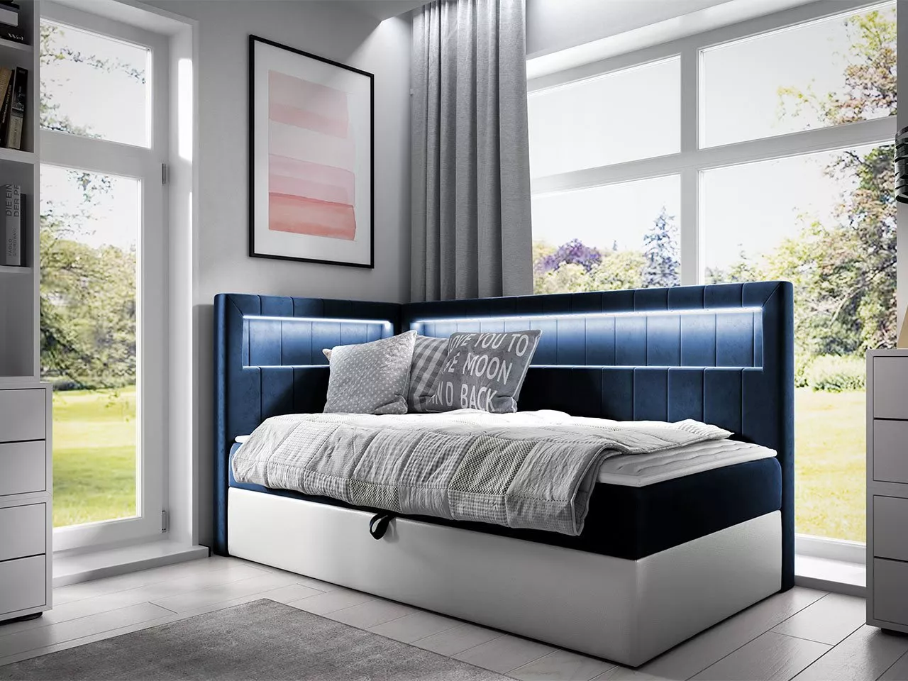 Boxspringová jednolůžková postel RAMIRA 3 je vysoce komfortním a mimořádně praktickým vybavením dětského či studentského pokoje. Postel o spací ploše 80x200 cm poskytuje pohodlný a zdravý spánek. Vyznačuje se vysokým čelem, které je vybaveno praktickou poličkou s LED osvětlením. Nechybí ani úložný prostor na lůžkoviny.
