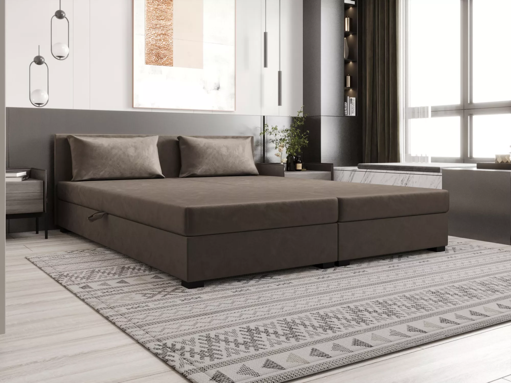 Kontinentální manželská postel 160x200 ROSIE 13 svým designem dokonale zapadne do interiéru každé ložnice. Díky 2 praktickým úložným prostorům a pohodlné matraci zajišťuje komfort při používání i při spánku. Designové čelo zamezí poškrábání a zašpinění zdi.
