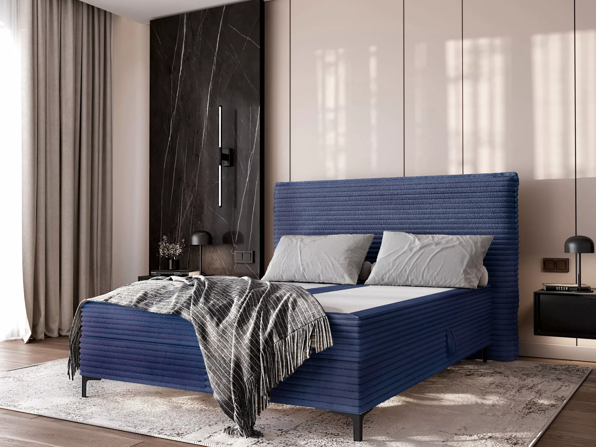 Kontinentální postel 140x200 MADRONA má vysoké čalouněné čelo, které zabrání zašpinění a poškrábání zdi. Postel disponuje úložným prostorem pro uložení ložního prádla nebo sezónního oblečení. Příjemná potahová látka zpříjemní každodenní používání.