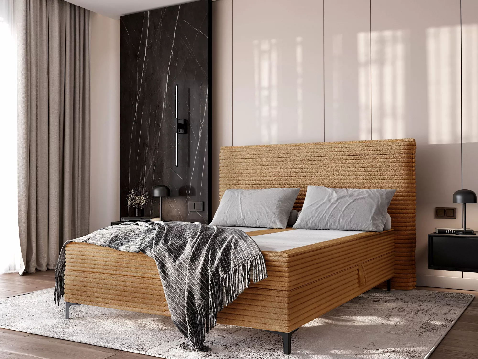 Kontinentální postel 180x200 MADRONA má vysoké čalouněné čelo, které zabrání zašpinění a poškrábání zdi. Postel disponuje úložným prostorem pro uložení ložního prádla nebo sezónního oblečení. Příjemná potahová látka zpříjemní každodenní používání.
