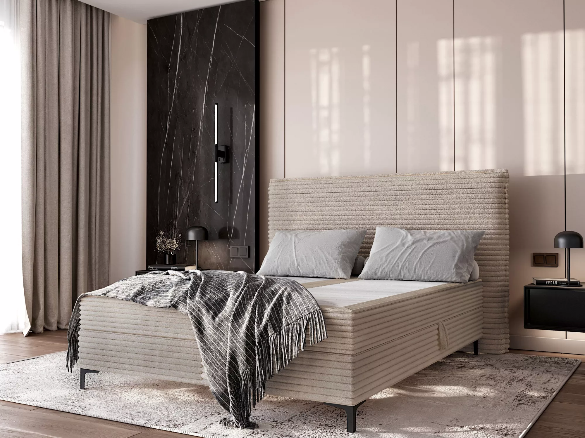 Kontinentální postel 200x200 MADRONA má vysoké čalouněné čelo, které zabrání zašpinění a poškrábání zdi. Postel disponuje úložným prostorem pro uložení ložního prádla nebo sezónního oblečení. Příjemná potahová látka zpříjemní každodenní používání.