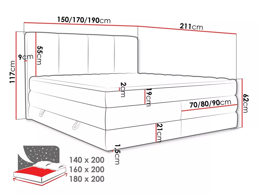 - čelo postele: masiv + LTD o síle 15 mm + vatelín o gramáži 600 g/m2