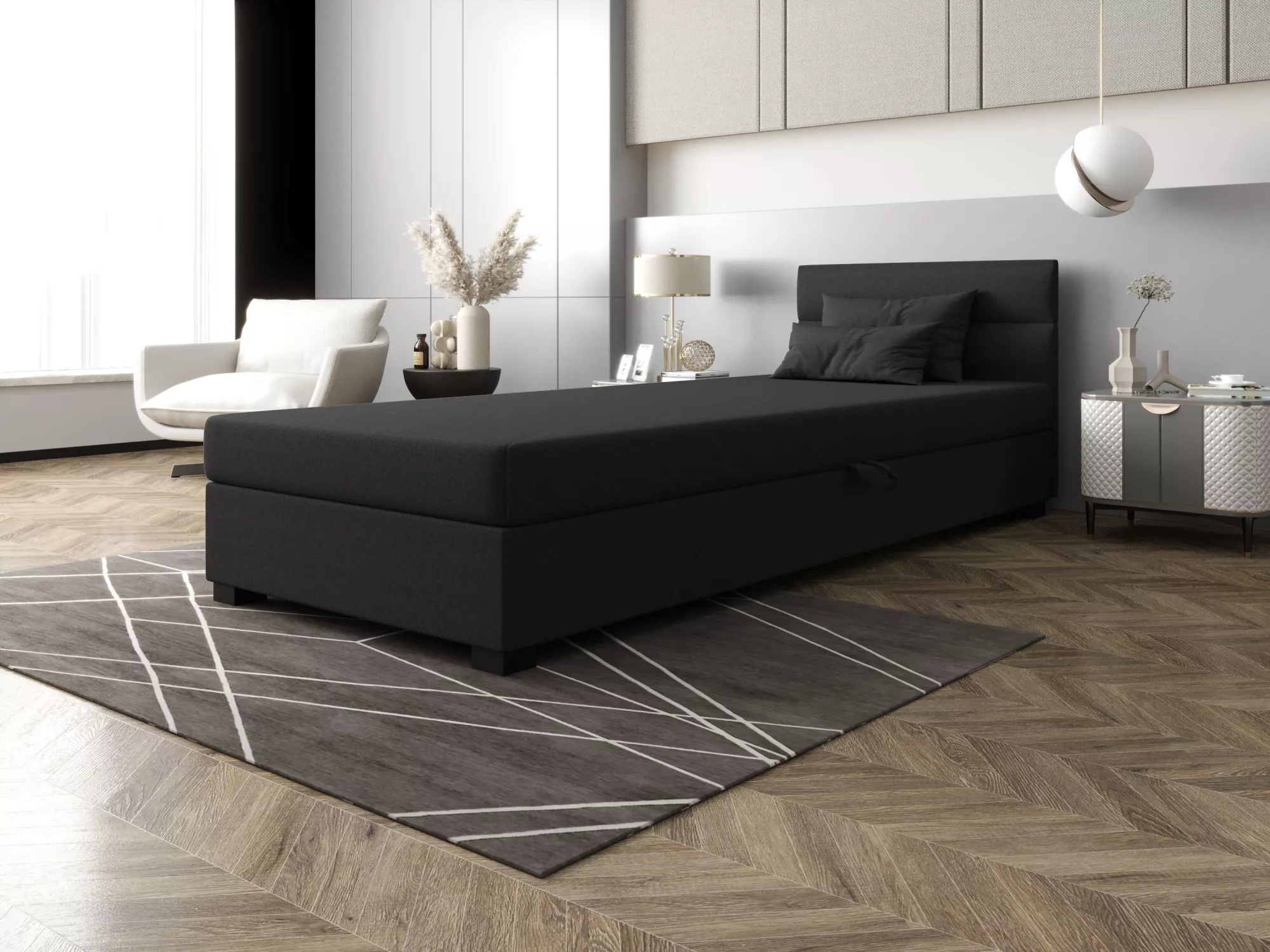 Jednolůžková čalouněná postel 90x195 NALINDA 1 disponuje prostorným úložným prostorem pro uložení ložního prádla nebo sezónního oblečení. Vysoké čalouněné čelo zpříjemní každou chvílí odpočinku a zabrání poškrábání a zašpinění zdi.