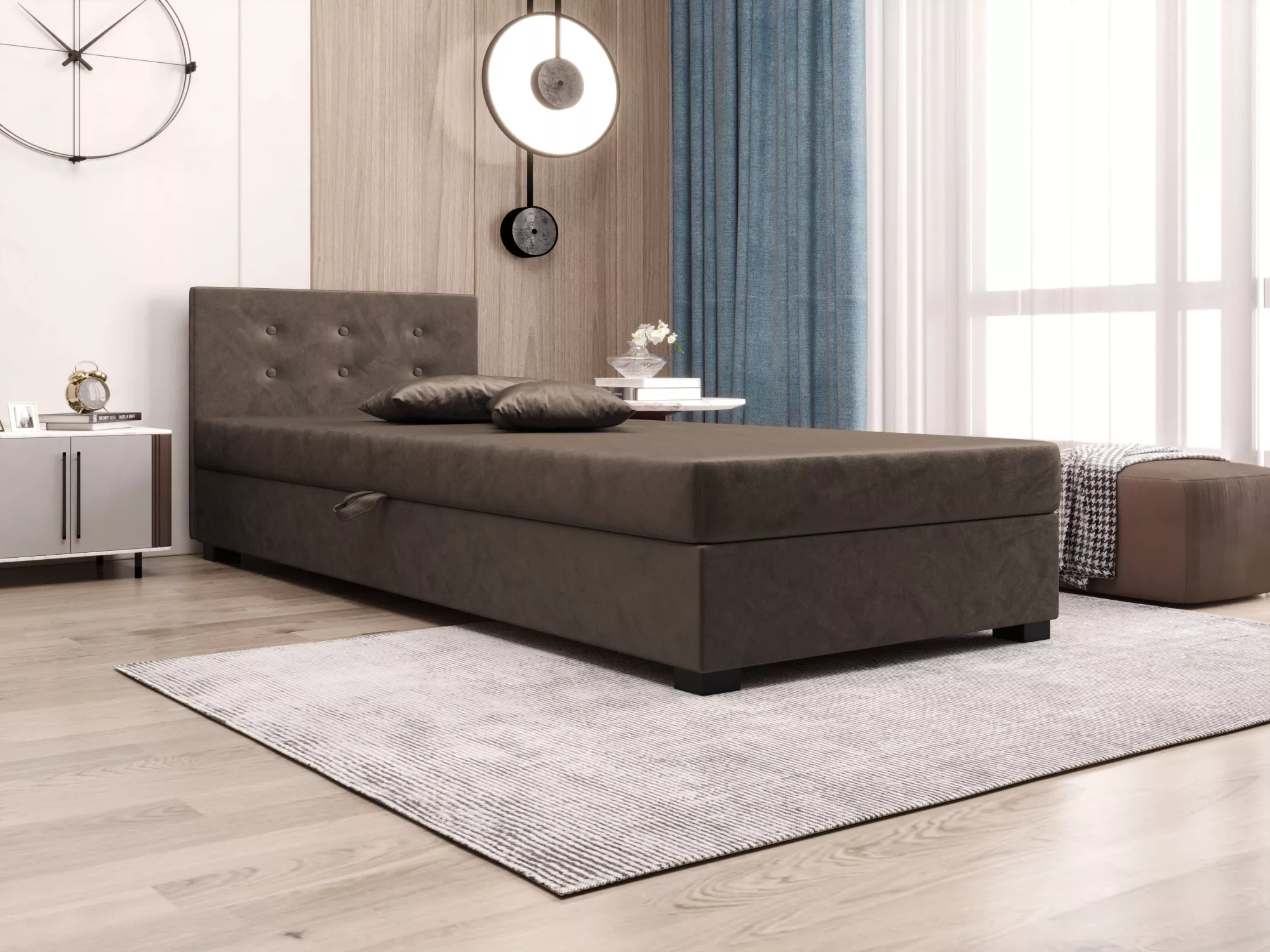 Jednolůžková postel 90x195 AJKA 1 na první pohled zaujme svým vysokým prošívaným čelem, které zabraňuje poškrábání a zašpinění zdi. Postel skvěle zapadne do každého studentského pokoje. Nechybí ani praktický úložný prostor pro uložení lůžkovin nebo sezónního oblečení.