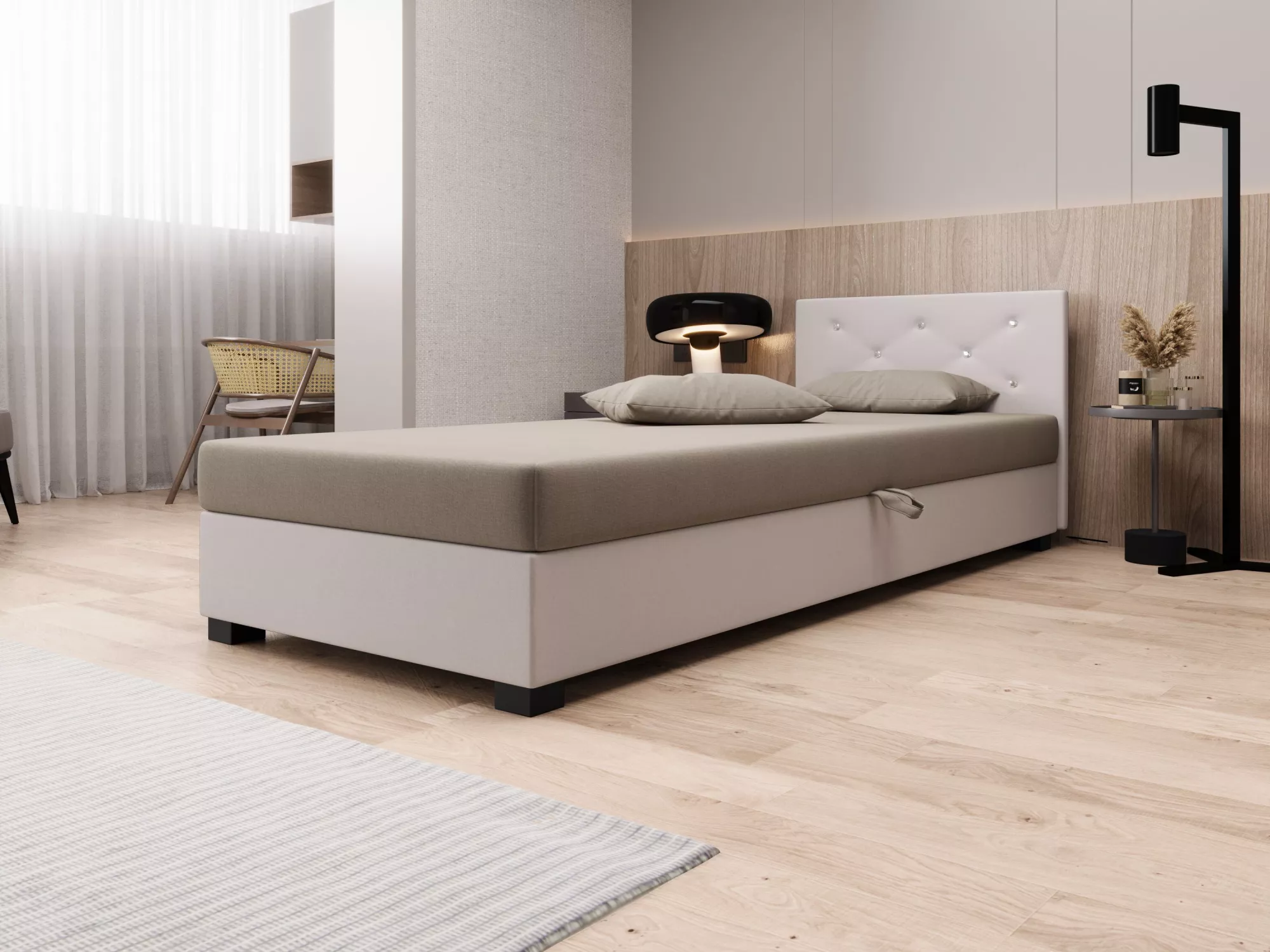Čalouněná postel 80x195 MILEKA 1 zaujme především svým prošívaným čelem s ozdobnými knoflíky. Pohodlná matrace poskytne veškerý komfort při odpočinku a relaxaci. Postel disponuje prostorným úložným prostorem, kde můžete schovat lůžkoviny nebo sezónní oblečení.