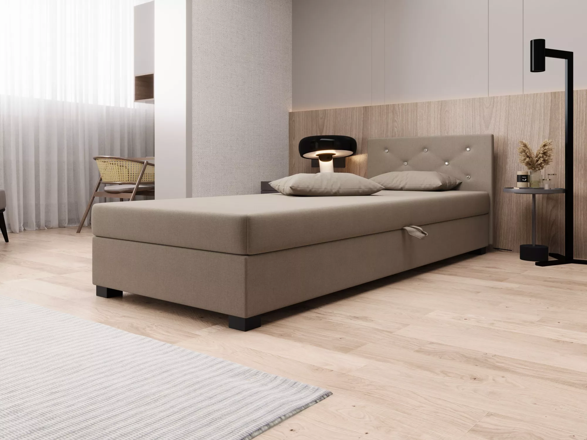 Čalouněná postel 80x195 MILEKA 1 zaujme především svým prošívaným čelem s ozdobnými knoflíky. Pohodlná matrace poskytne veškerý komfort při odpočinku a relaxaci. Postel disponuje prostorným úložným prostorem, kde můžete schovat lůžkoviny nebo sezónní oblečení.