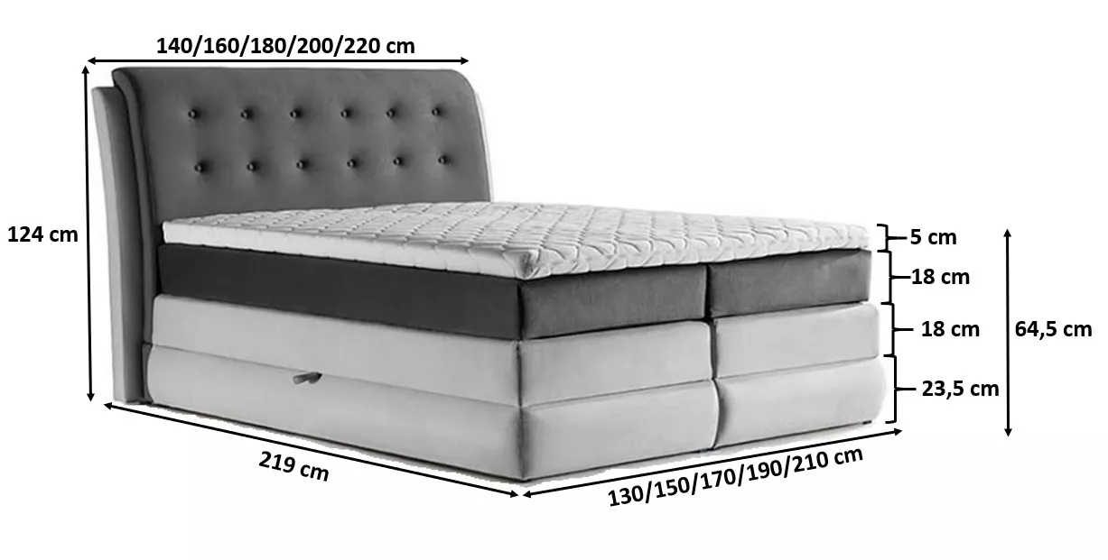 Kontinentální postel Vika bude ideální pro ložnici, ale také například pro hotelový pokoj. Postel má krásně prošité čelo, které je ozdobené knoflíky. Dvojitá matrace a topper zajišťují dokonalý komfort spánku.