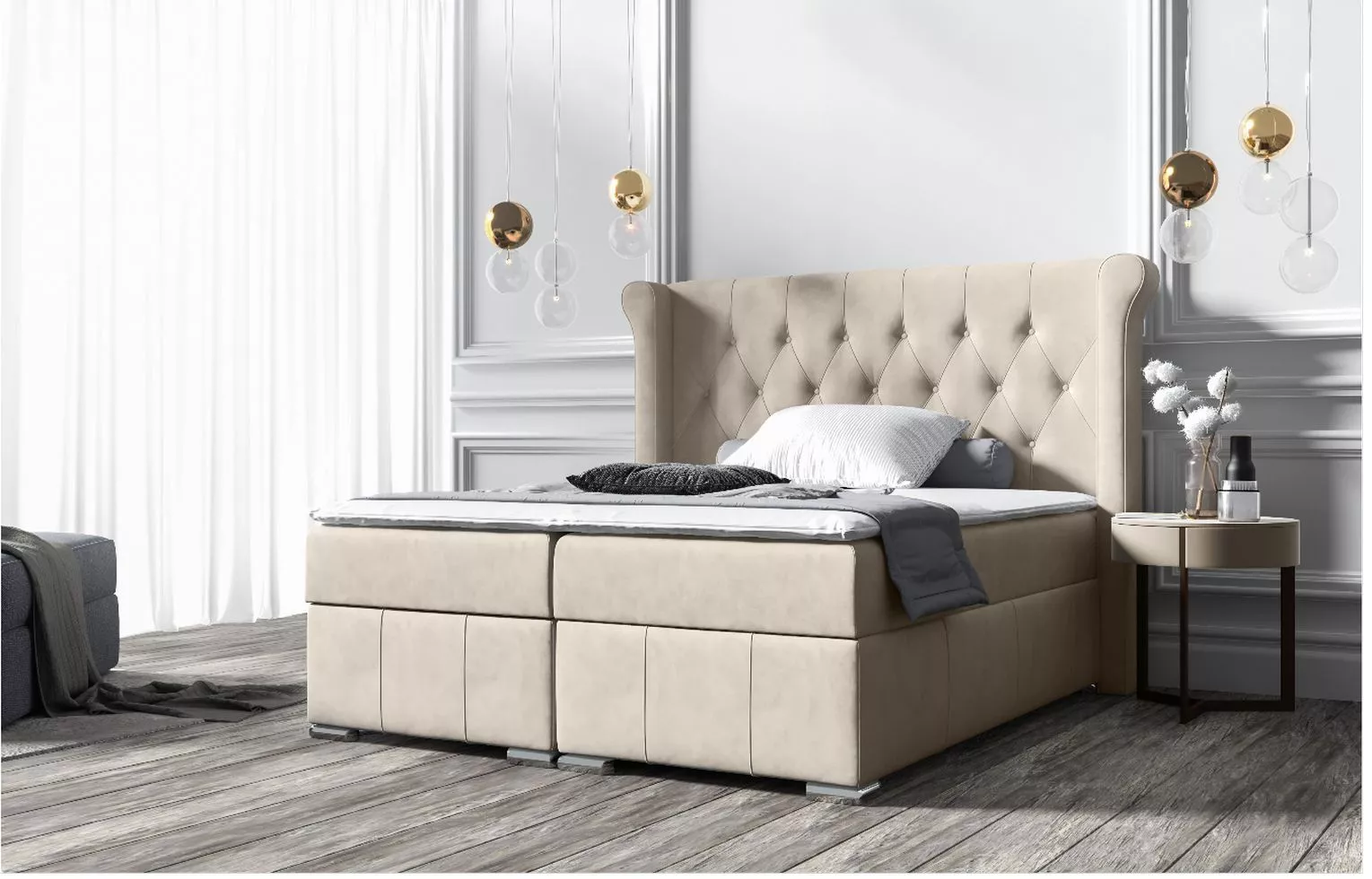 Pokud se rozhodnete pro kontinentální postel MAXIMO, pocítíte ve své ložnici nebývalý komfort. Dominantou je prošívané čelo s ozdobnými knoflíky v záhlaví postele, laděné do zámeckého stylu. Celá postel je vyrobena z vysoce kvalitních materiálů, které zaručují spokojenost uživatelů po dlouhá léta. Úložný prostor s bočním otevíráním naleznete pod matracemi.