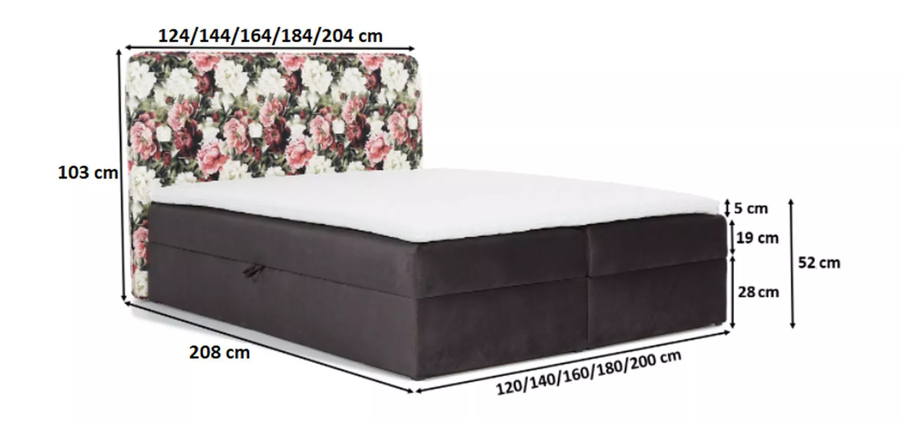 Představujeme vám čalouněnou postel boxspring DEA ve vintage desingu. Vysoké čelo s květinovým vzorem je navíc praktické ke každodenní relaxaci. Komfortní spaní zaručí zabudovaná matrace s topperem, který dostanete zdarma. Matrace je položena na dřevěném rámu a je tvořena bonellovými pružinami s PUR pěnou T30.