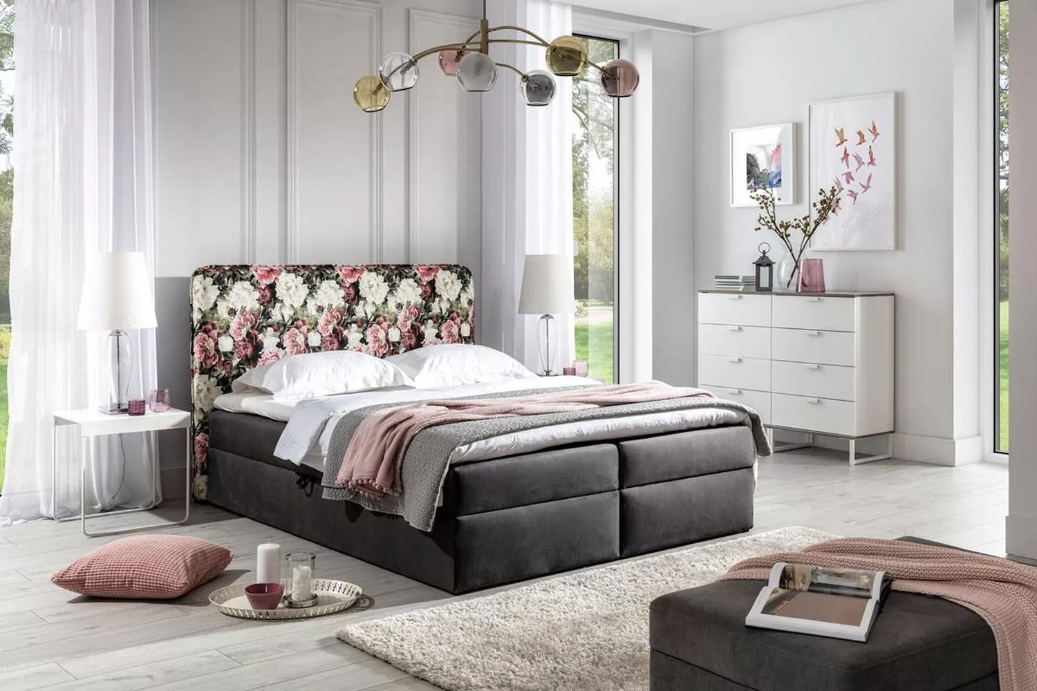 Čalouněná postel 200x200 DEA - květy / černá + topper ZDARMA