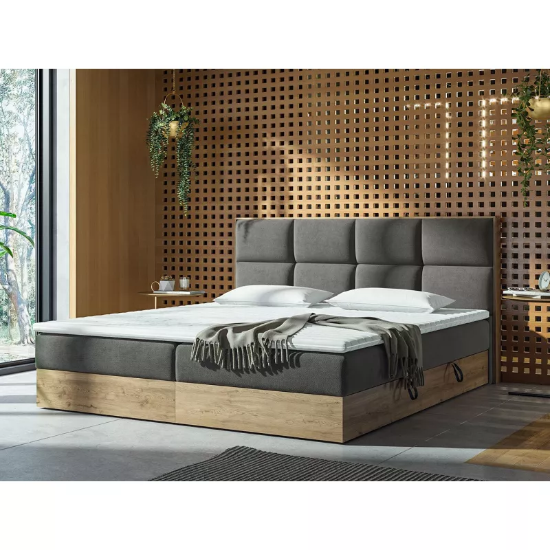 Kontinentální postel JERSEY o spací ploše 180x200 cm je moderní model, který dokonale kombinuje texturu látky se strukturou dřeva. Kombinace materiálu příjemného na dotek s přírodní dekorem dřeva dodává místnosti útulnost. Postel je vybavená kvalitní matrací a topperem, které vašemu tělu poskytnou dostatečnou oporu a zajistí pohodlí a relaxaci během spánku. Samozřejmostí je dvoukomorový úložný prostor na lůžkoviny.