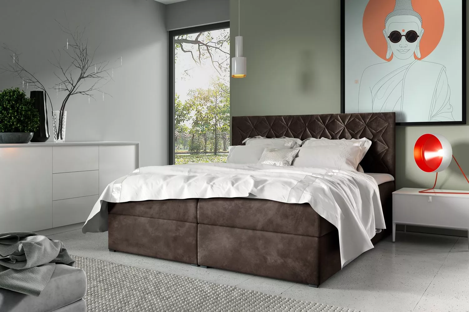 Boxspringovou postel EUGENA si zamilujete. Originálně prošívané čelo vám zajistí pohodlné opření, středně tvrdá taštičková matrace vytvoří optimální podmínky pro kvalitní spánek.