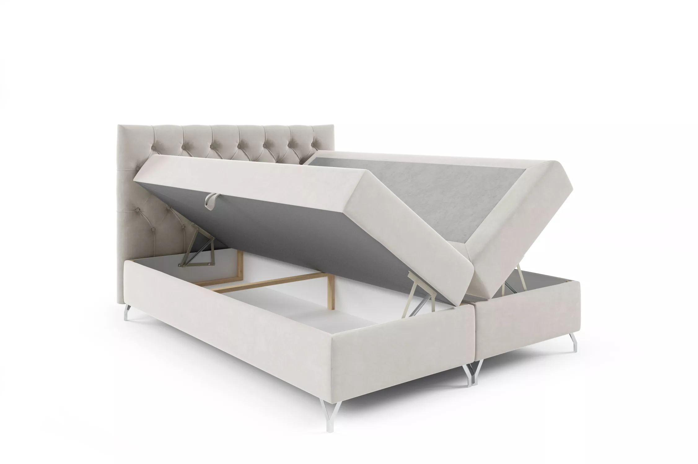 Luxusní boxspringová postel SHANNON je synonymem komfortu. Prošívané čelo zajistí pohodlné opření při čtení, nadčasovou eleganci podtrhují vysoké kovové nožky.