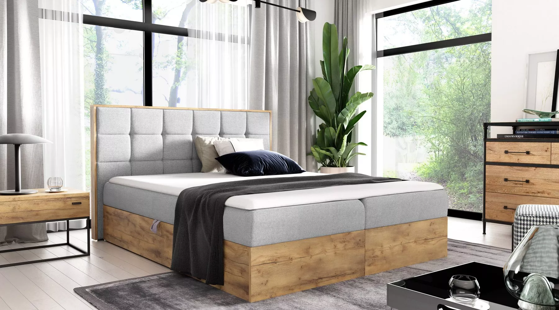 Nápaditá postel s vysokým čalouněným čelem vyniká jedinečným loftovým charakterem. O komfort při spánku se postará taštičková matrace a pohodlný topper z vysoce elastické pěny, oceníte také praktický úložný prostor.
