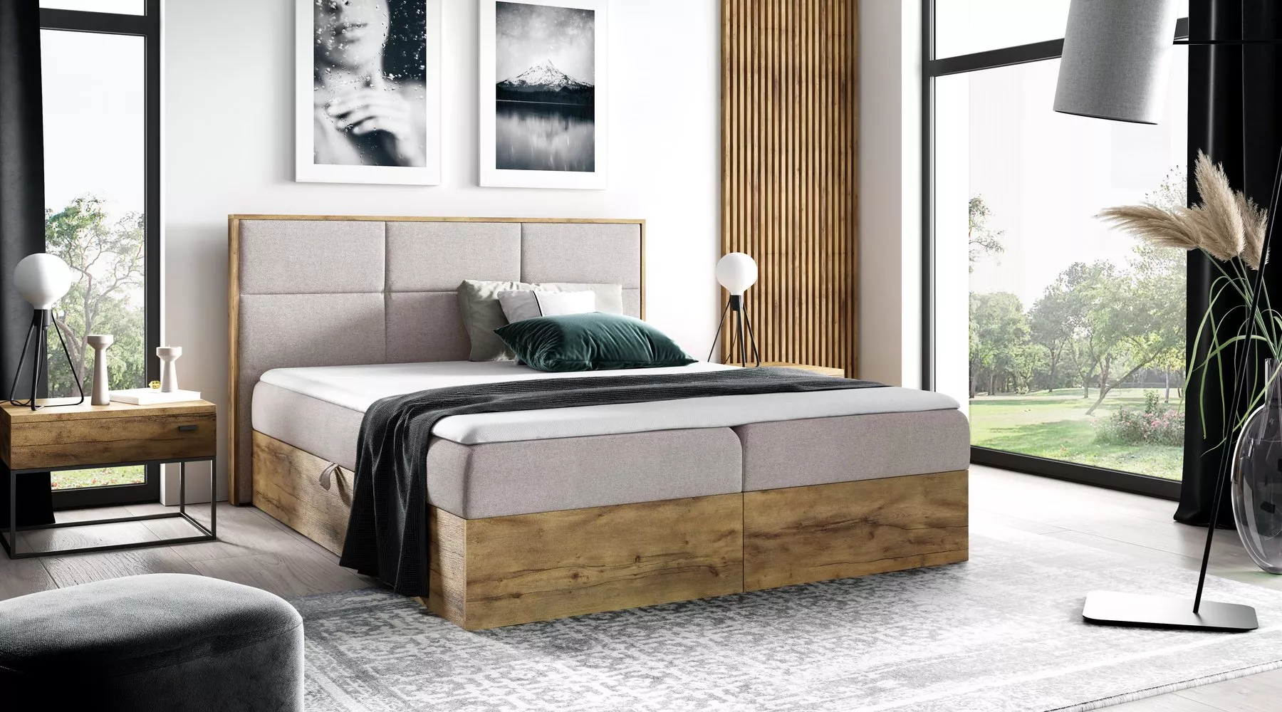 Nápaditá postel s vysokým čalouněným čelem vyniká jedinečným loftovým charakterem. O komfort při spánku se postará taštičková matrace a pohodlný topper z vysoce elastické pěny, oceníte také praktický úložný prostor.