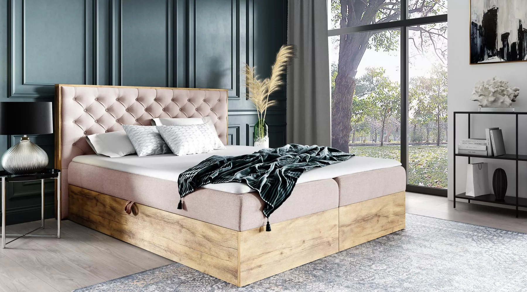 Nápaditá postel s vysokým čalouněným čelem vyniká jedinečným loftovým charakterem. O komfort při spánku se postará taštičková matrace a pohodlný topper z vysoce elastické pěny, oceníte také praktický úložný prostor.
