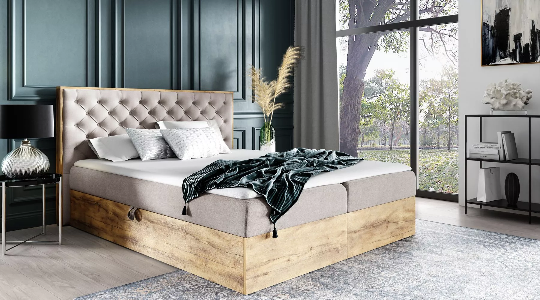 Nápaditá postel s vysokým čalouněným čelem vyniká jedinečným loftovým charakterem. O komfort při spánku se postará taštičková matrace a pohodlný topper z vysoce elastické pěny, oceníte také praktický úložný prostor.