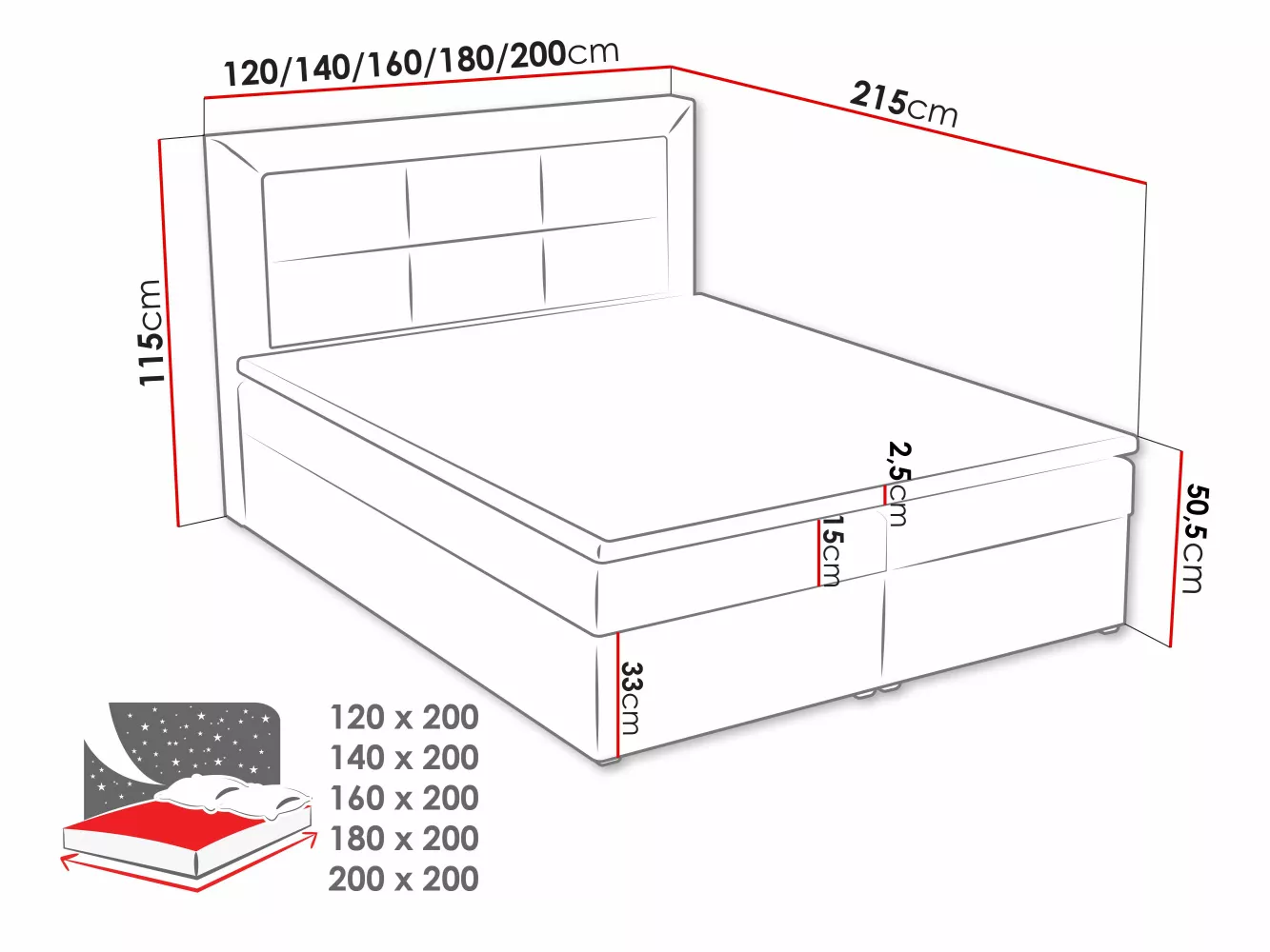 Boxspringová manželská postel PALIGEN 1 o spací ploše 180x200 cm je vybavena kvalitní pružinovou matrací a topperem, které vám zajistí správnou oporu páteře a uvolnění během spánku. Prošívané vysoké čelo je dekorativním prvkem a zároveň praktickou ochranou stěny. Další výhodou postele je dvojitý úložný prostor na lůžkoviny.
