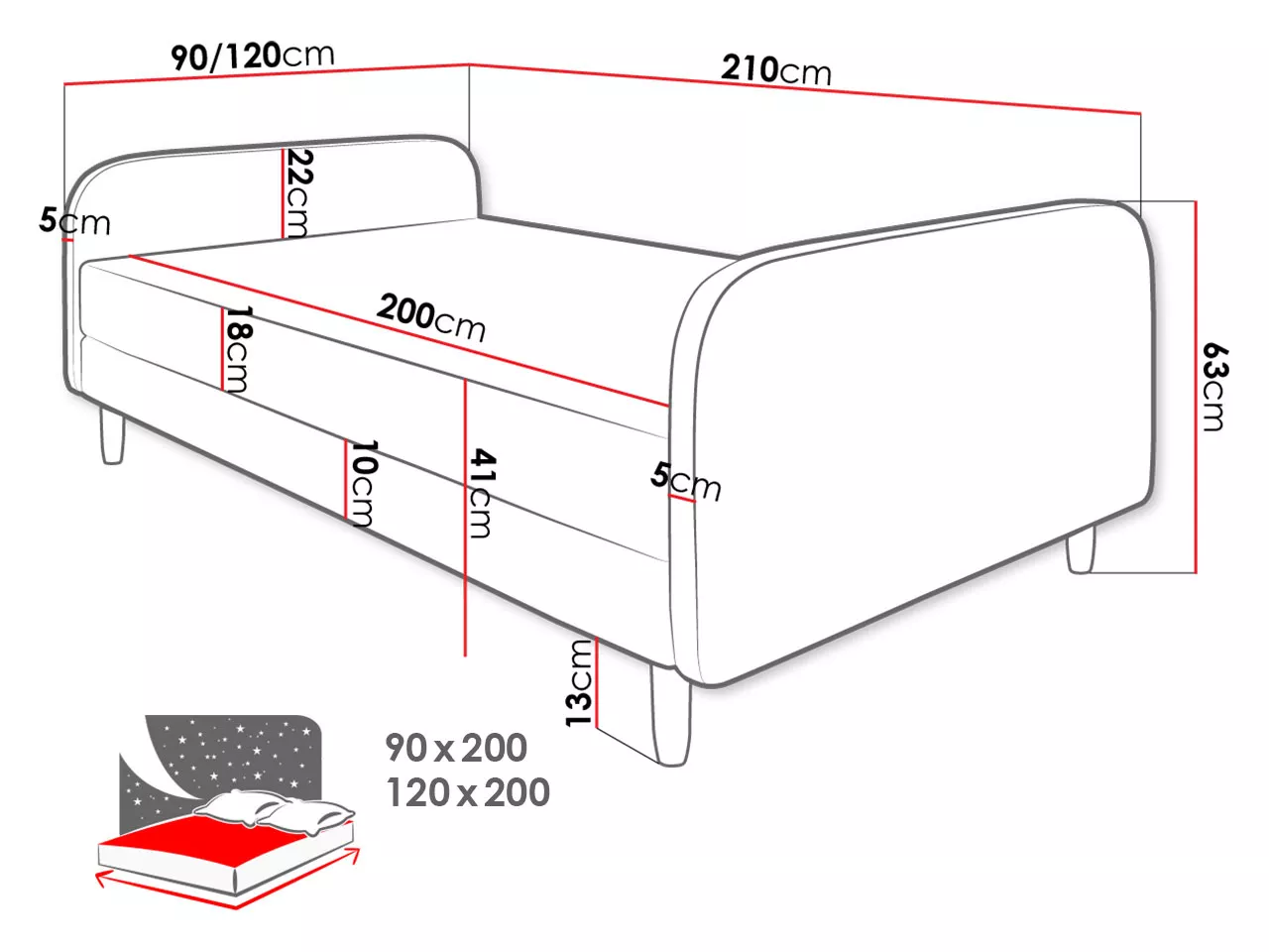 - ložná plocha: 90x200 cm