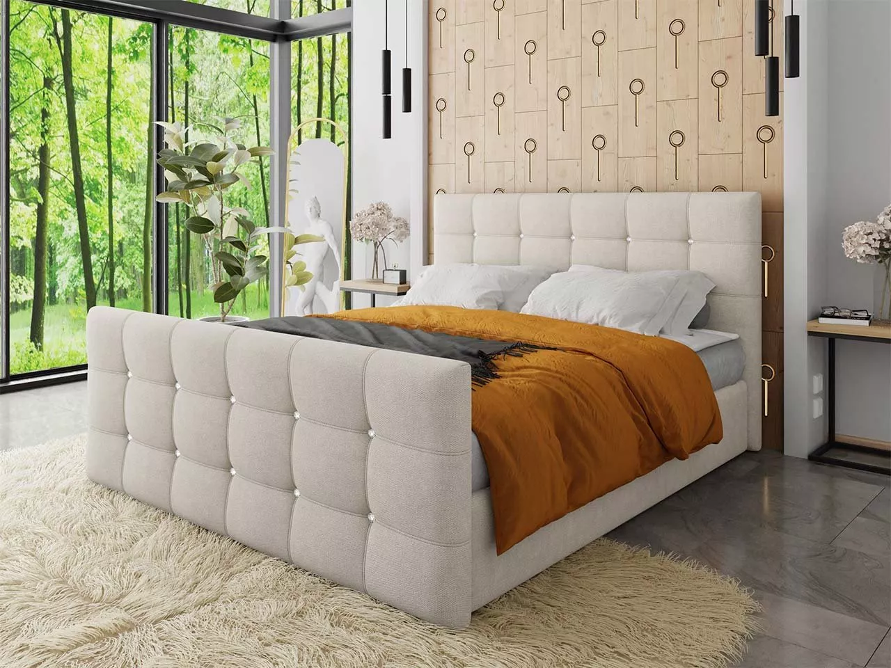 Americká manželská postel TORNIO o spací ploše 180x200 se vyznačuje vysokým prošívaným čelem, které je nejen dekorativním prvkem, ale zároveň i praktickou ochranou stěny. Další výhodou postele je dvoukomorový úložný prostor. Vestavěná pružinová matrace zodpovídá za správnou podporu páteře během spánku, přičemž vrchní pěnový topper zvyšuje pocit pohodlí.