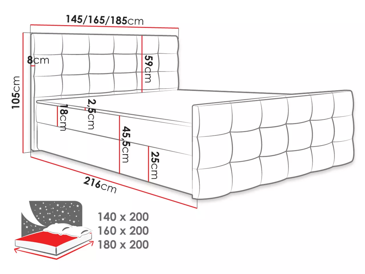 - ložná plocha: 180x200 cm