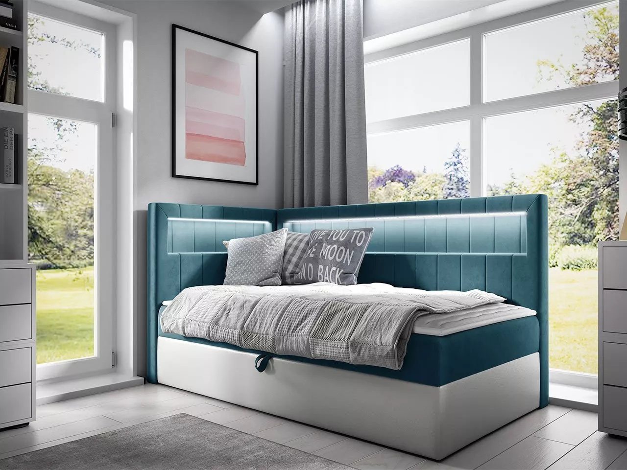 Boxspringová jednolůžková postel RAMIRA 3 je vysoce komfortním a mimořádně praktickým vybavením dětského či studentského pokoje. Postel o spací ploše 100x200 cm poskytuje pohodlný a zdravý spánek. Vyznačuje se vysokým čelem, které je vybaveno praktickou poličkou s LED osvětlením. Nechybí ani úložný prostor na lůžkoviny.