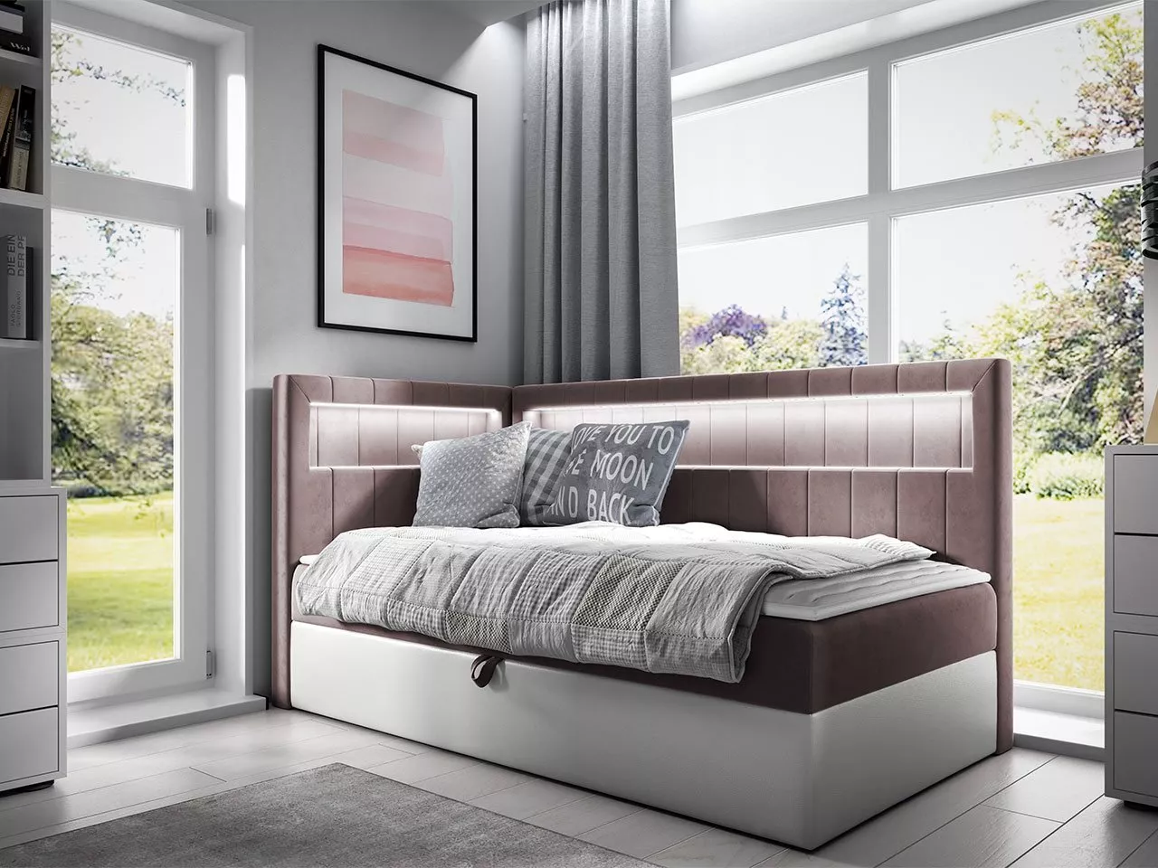 Boxspringová jednolůžková postel RAMIRA 3 je vysoce komfortním a mimořádně praktickým vybavením dětského či studentského pokoje. Postel o spací ploše 80x200 cm poskytuje pohodlný a zdravý spánek. Vyznačuje se vysokým čelem, které je vybaveno praktickou poličkou s LED osvětlením. Nechybí ani úložný prostor na lůžkoviny.