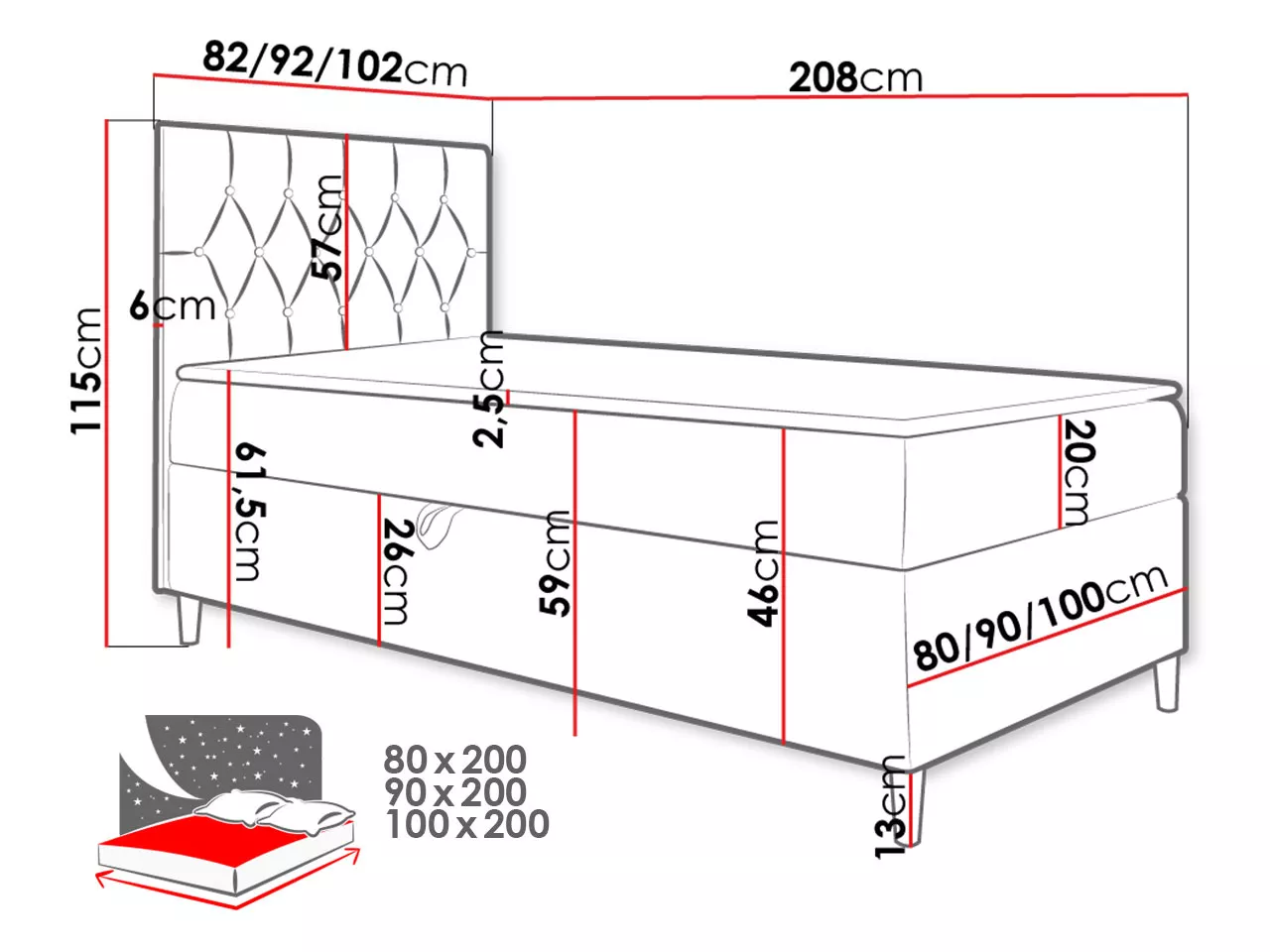 Boxspringová jednolůžková postel PORFIRO 1 je model určený do dětských a studentských pokojů. Postel o spací ploše 90x200 cm je vyrobena z kvalitních komponentů, které zodpovídají za zdravý spánek a pocit relaxace. Nechybí ani úložný prostor na lůžkoviny.