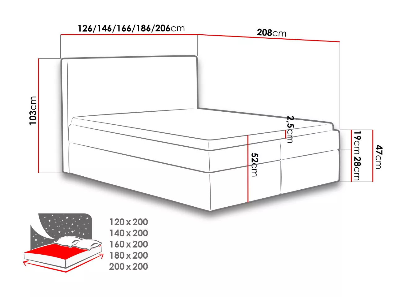 - ložná plocha: 200x200 cm