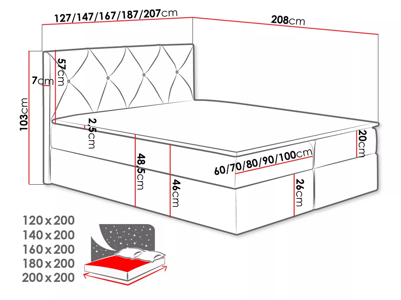 - ložná plocha: 200x200 cm