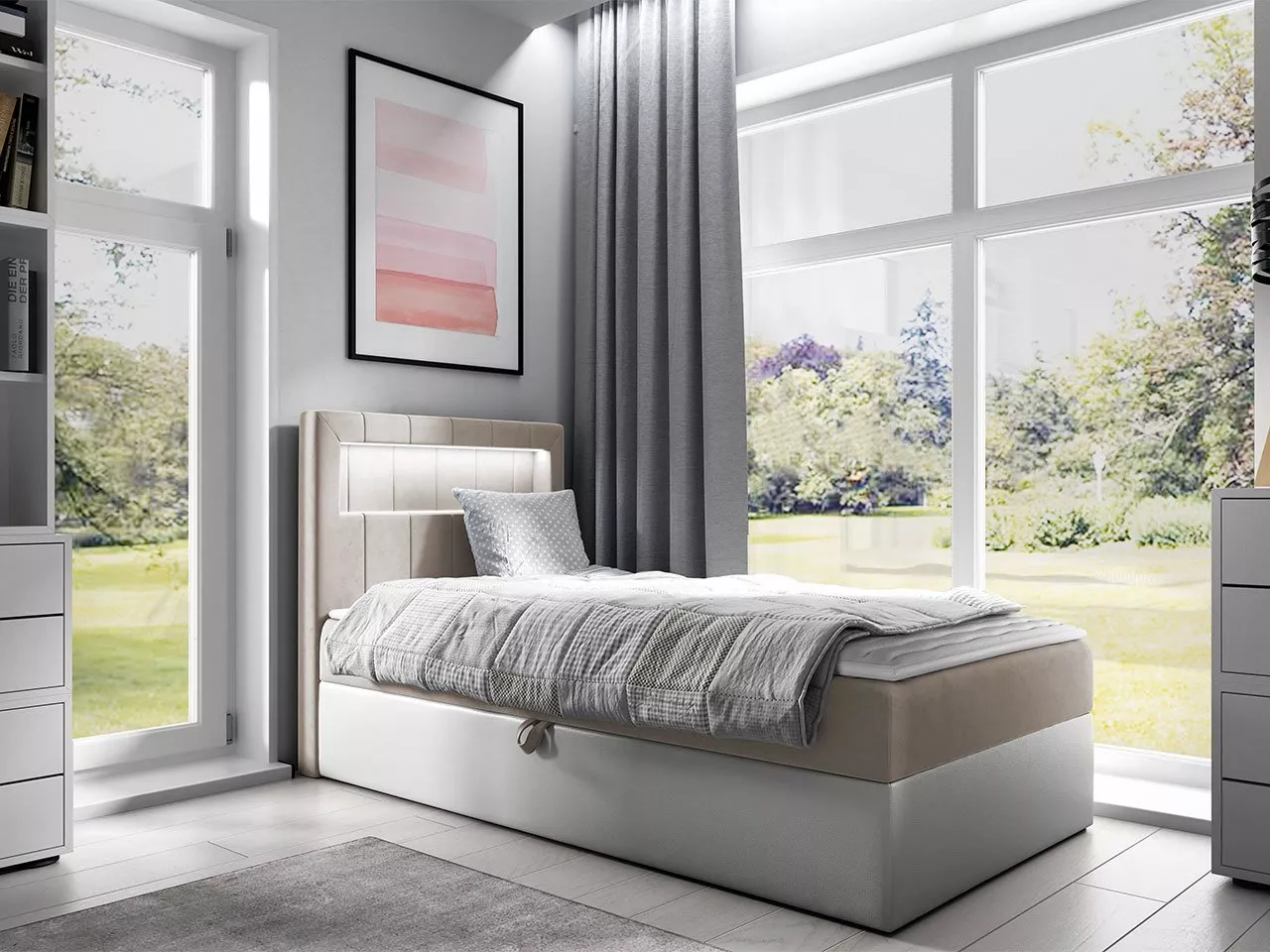 Kontinentální jednolůžková postel RAMIRA 1 je vysoce komfortním a mimořádně praktickým vybavením dětského či studentského pokoje. Postel o spací ploše 100x200 cm poskytuje pohodlný a zdravý spánek. Vyznačuje se vysokým čelem, které je vybaveno praktickou poličkou s LED osvětlením. Nechybí ani úložný prostor na lůžkoviny.