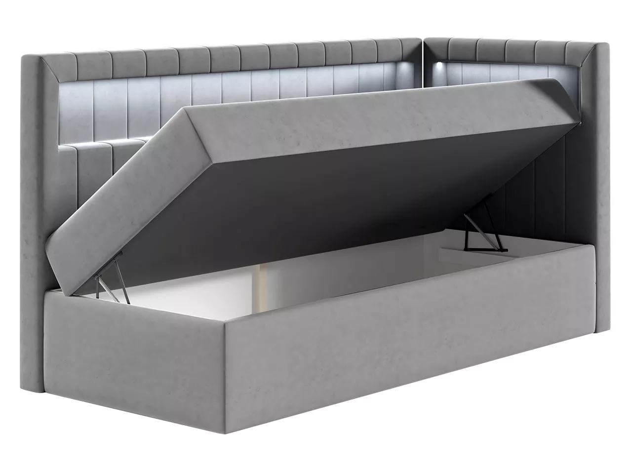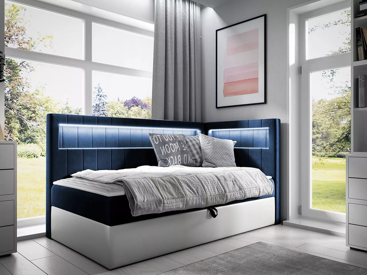 Boxspringová jednolůžková postel RAMIRA 3 je vysoce komfortním a mimořádně praktickým vybavením dětského či studentského pokoje. Postel o spací ploše 100x200 cm poskytuje pohodlný a zdravý spánek. Vyznačuje se vysokým čelem, které je vybaveno praktickou poličkou s LED osvětlením. Nechybí ani úložný prostor na lůžkoviny.