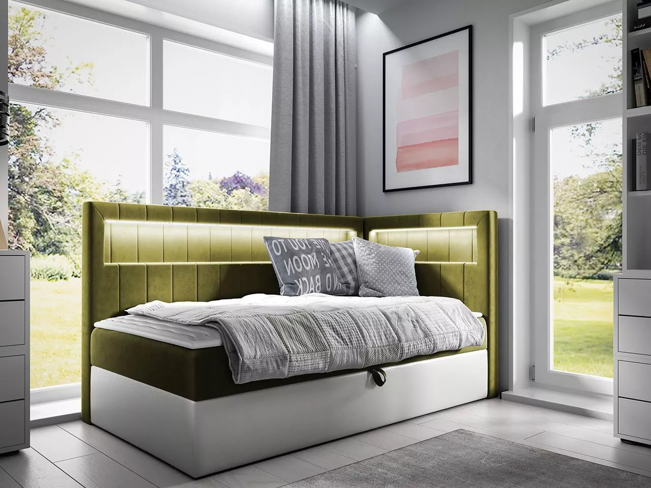 Boxspringová jednolůžková postel RAMIRA 3 je vysoce komfortním a mimořádně praktickým vybavením dětského či studentského pokoje. Postel o spací ploše 80x200 cm poskytuje pohodlný a zdravý spánek. Vyznačuje se vysokým čelem, které je vybaveno praktickou poličkou s LED osvětlením. Nechybí ani úložný prostor na lůžkoviny.